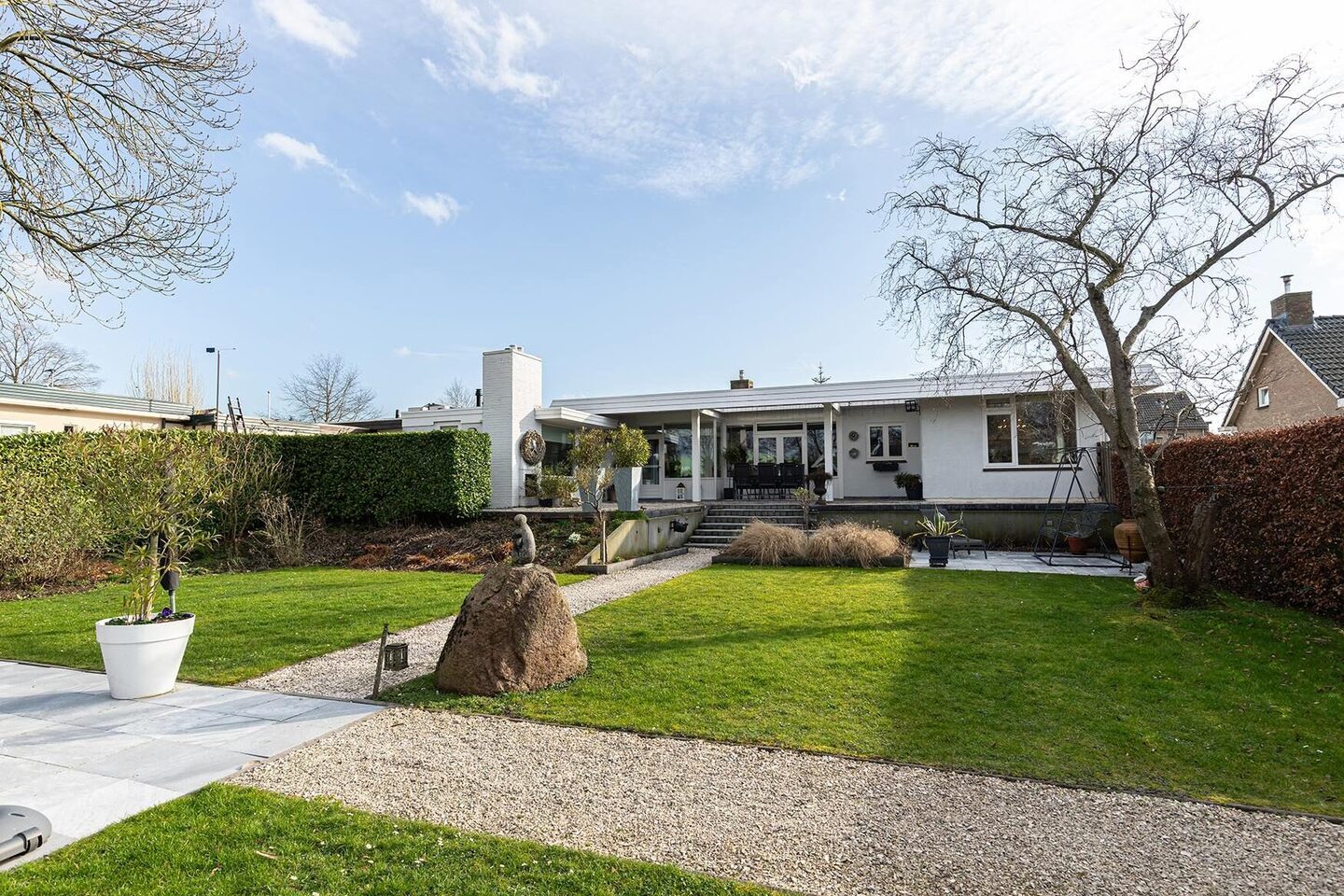 Deze royale vrijstaande bungalow staat op een prachtig perceel van maar liefst 1.373 m² en biedt precies die combinatie van comfort, privacy en uitstraling die u in het hogere segment mag verwachten. De woning beschikt over een inpandige garage, parkeergelegenheid op eigen terrein voor circa vier auto’s en een fraai aangelegde tuin rondom. De ligging in een rustige woonomgeving maakt het geheel extra aantrekkelijk, met voorzieningen, supermarkt en het dorpscentrum op korte afstand.