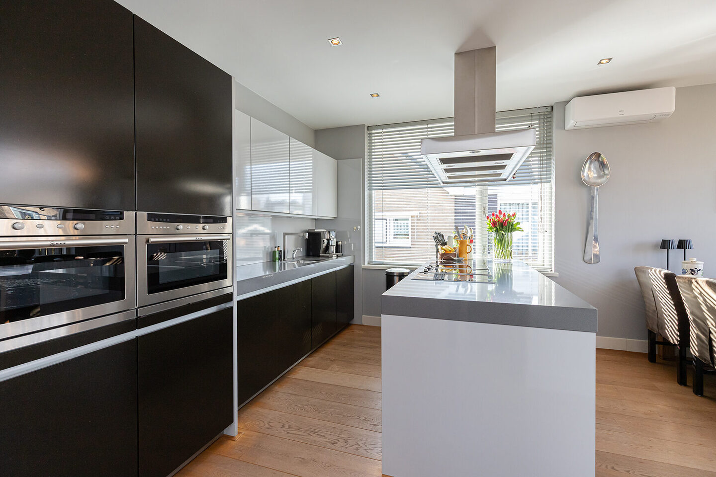 De luxe Eggersmann-keuken uit 2007 is uitgevoerd in een stijlvolle zwart-grijze kleurstelling en afgewerkt met een grijs composiet werkblad. Een echte leefkeuken voor kookliefhebbers, compleet met een uitgebreide apparatenwand en hoogwaardige inbouwapparatuur. Zo beschikt de keuken over twee inductiekookplaten, twee combimagnetrons, een extra magnetron, oven, vaatwasser, twee koelkasten, een vriezer, afzuigkap, Quooker, close-in boiler, grill en frituur. Ook hier is airconditioning aanwezig.