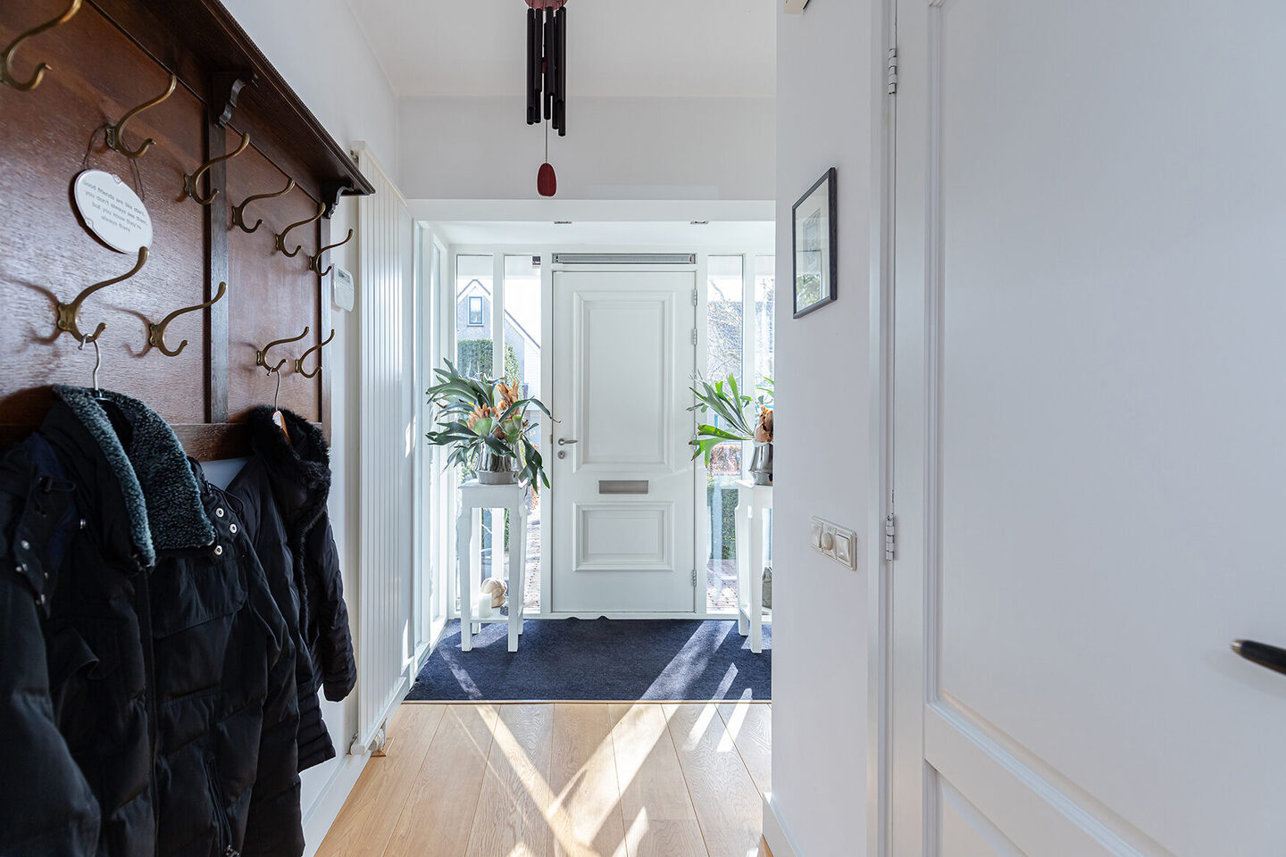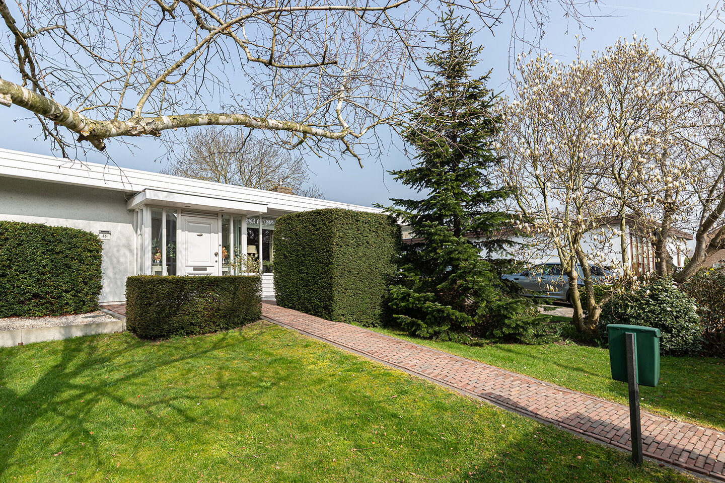 De bungalow ligt iets verhoogd ten opzichte van de tuin, wat zorgt voor een fraai overzicht en extra cachet. Via de entree komt u binnen in een lichte ontvangsthal met grote raampartijen, waardoor het daglicht hier rijkelijk binnenvalt. Vanuit deze hal zijn onder meer de meterkast, de toiletruimte en een slaapkamer bereikbaar. Aansluitend komt u in de centrale hal, die toegang geeft tot de overige vertrekken.