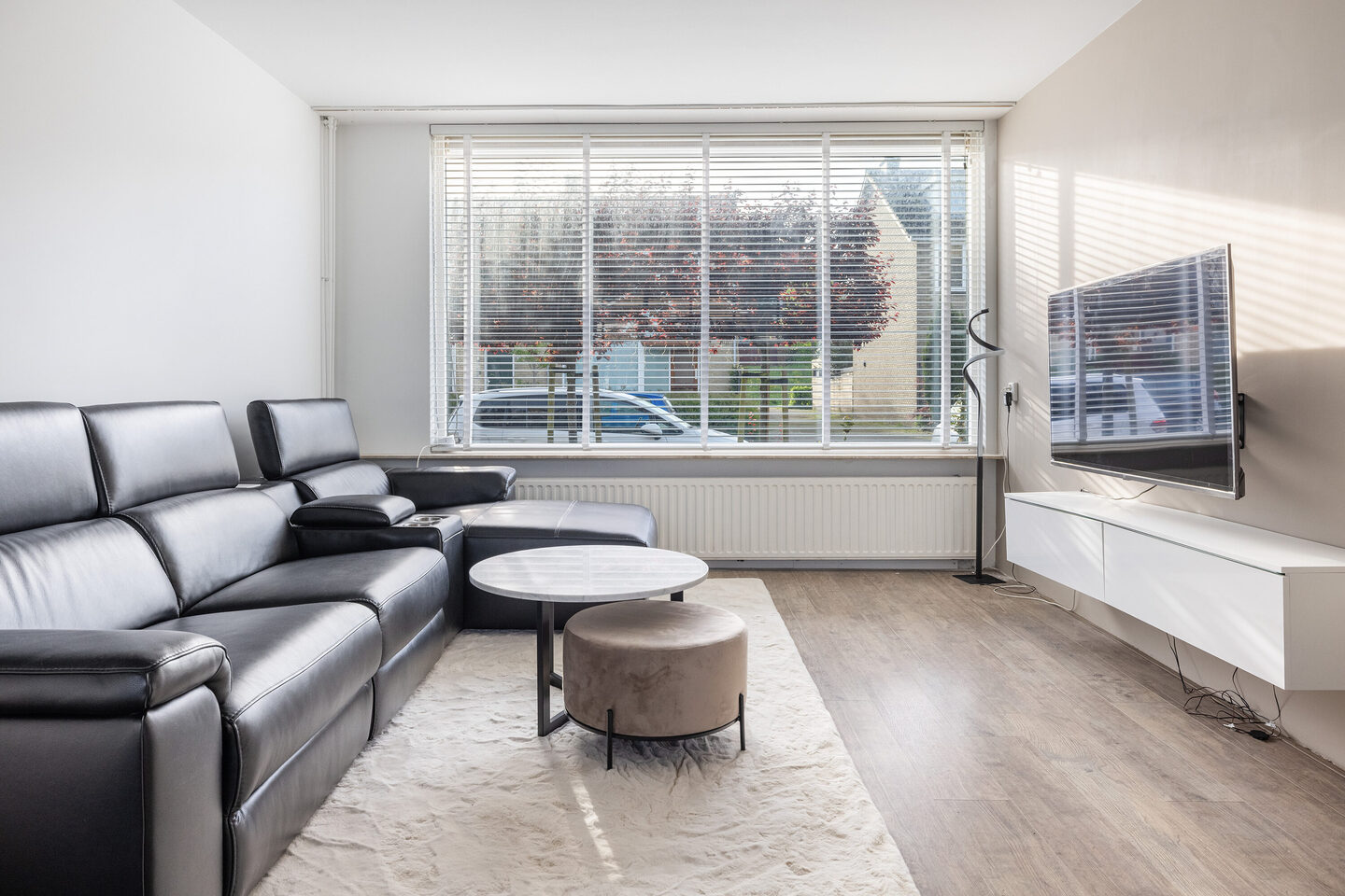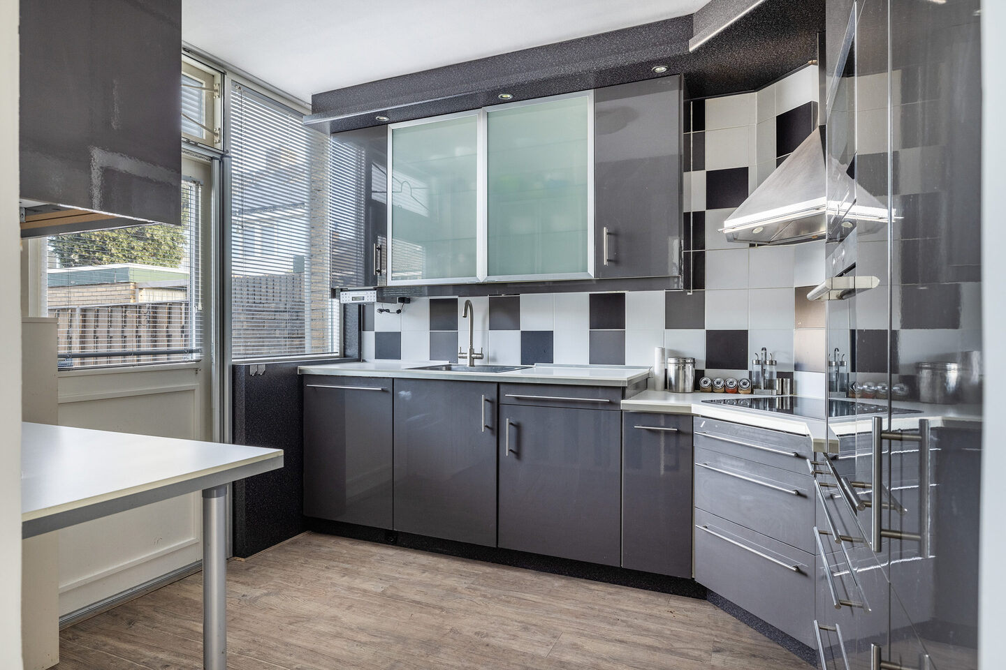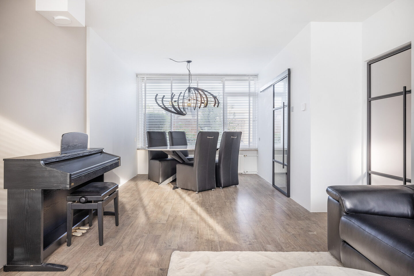 De woonkamer is ruim opgezet, met een zithoek aan de voorzijde en een eetgedeelte aan de tuinzijde. De open keuken sluit aan op het eetgedeelte en is voorzien van een inductiekookplaat, afzuigkap, vaatwasser, magnetron, oven en koel-vriescombinatie. Vanuit de keuken is er directe toegang tot de achtertuin, gelegen op het westen.