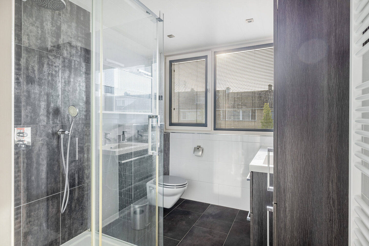 De badkamer is uitgerust met een inloopdouche, dubbele wastafel met meubel en een tweede toilet.