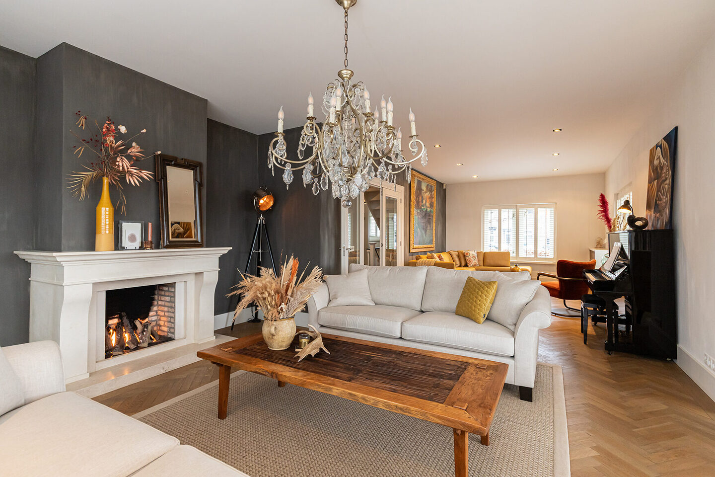 De begane grond biedt een indrukwekkende leefruimte. De sfeervolle woonkamer met erker en panoramisch uitzicht op het water is het hart van de woning. De stijlvolle schouw met gashaard, shutters en een visgraat gelegde eiken parketvloer geven deze ruimte een warme en elegante uitstraling.