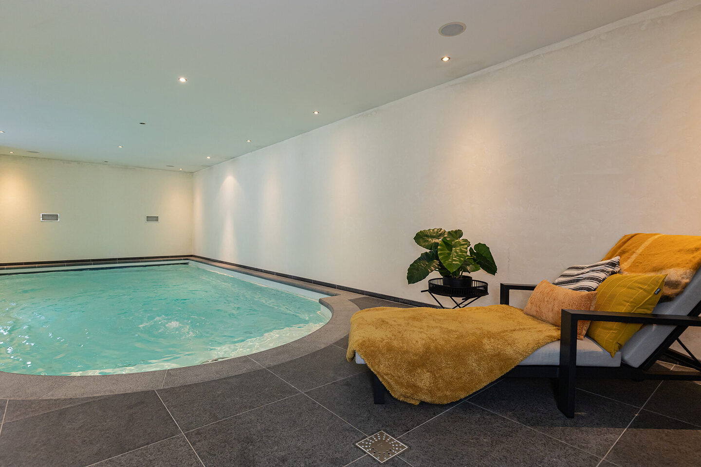 De unieke toevoeging aan de woning is het inpandige zwembad met jetstream, infraroodsauna, doucheruimte en separate toiletruimte. Deze luxueuze wellnessruimte vormt een serene plek om te ontspannen, met directe toegang tot de tuin.