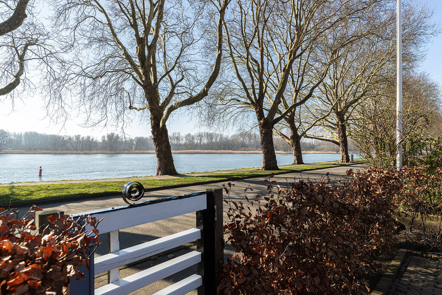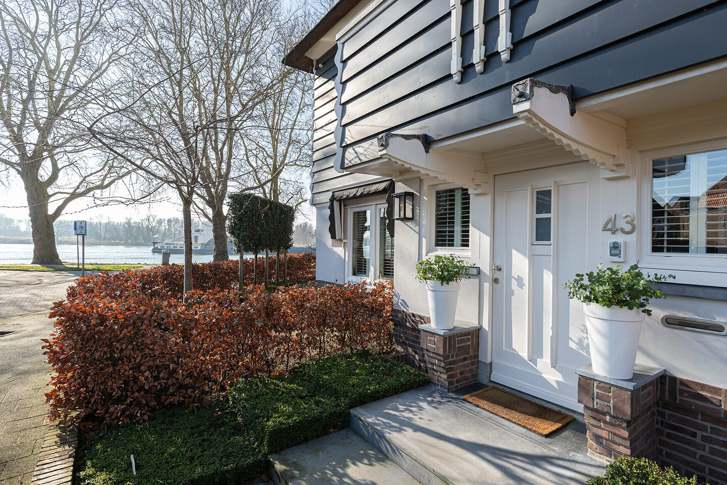 De fraai aangelegde tuin sluit naadloos aan bij de klassieke uitstraling van de villa. Strakke sierbestrating, meerdere zitgedeeltes, sfeervolle buitenverlichting en slim geplaatste hagen zorgen voor privacy. Het deels overdekte terras op het zuiden is de ideale plek om beschut te genieten van de seizoenen. Vanuit de open gedeelten van de tuin blijft het indrukwekkende uitzicht op de rivier behouden.