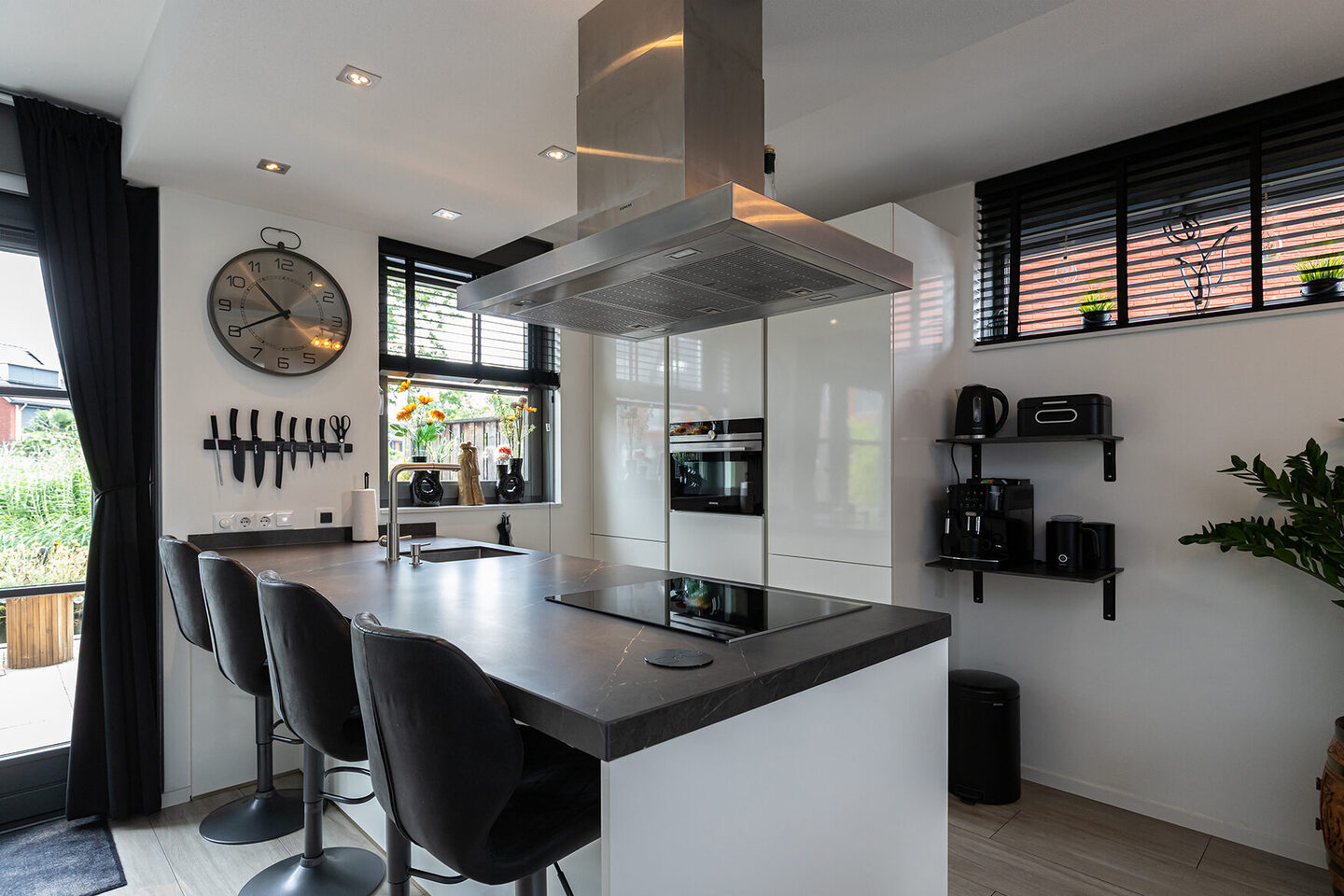 De open keuken heeft een kook spoeleiland met voldoende zitruimte, ideaal om tijdens het koken even samen te zitten. De hoogwaardige inrichting in hoogglans wit (Silverline Y line), gecombineerd met een marazzi keramiek werkblad in marble look “Imperiale”, geeft een luxe uitstraling. Alle apparatuur is aanwezig: inductiekookplaat, combi-oven met magnetron. Alles in perfect balans tussen design en functionaliteit.