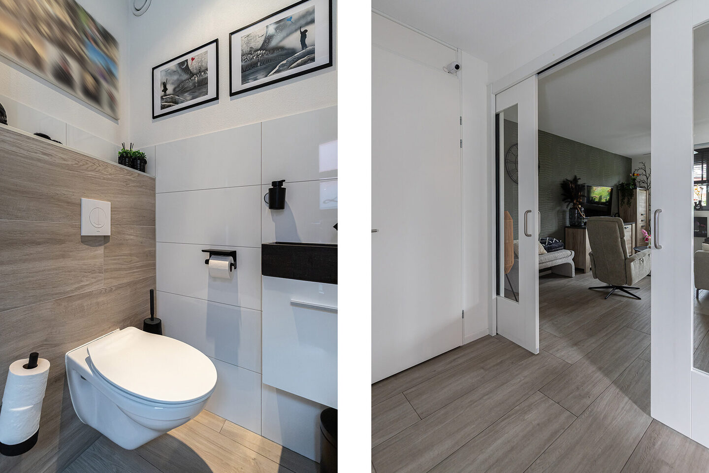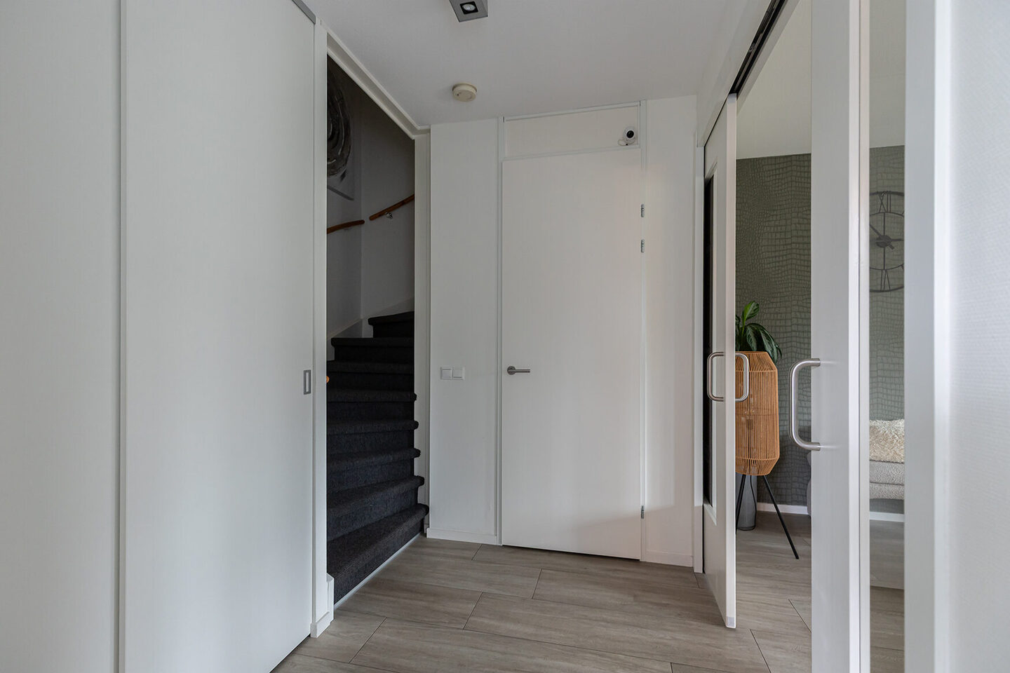 De begane grond is voorzien van lichte houtkleurige plavuizen met vloerverwarming, wat het interieur een moderne en comfortabele sfeer geeft. Op de eerste verdieping kom je via de overloop bij twee ruime slaapkamers, waar de voorzijdekamer is uitgerust met een inbouwkast (Ikea PAX). De verdieping is afgewerkt met een laminaatvloer en behangen wanden. Beide slaapkamers zijn uitgerust met airconditioning.