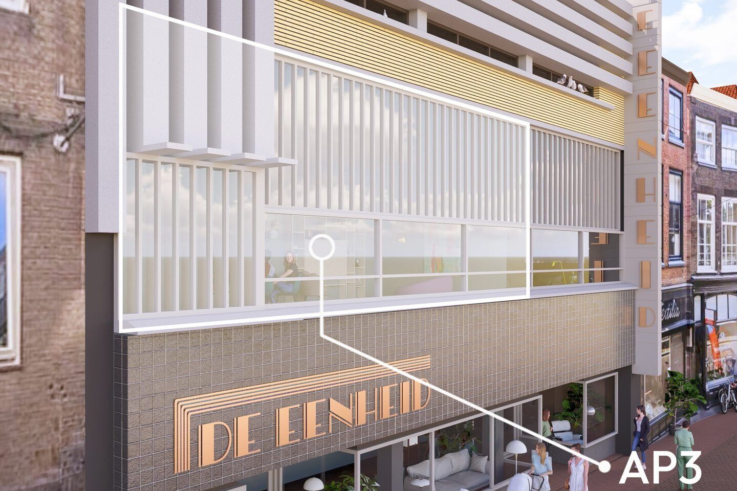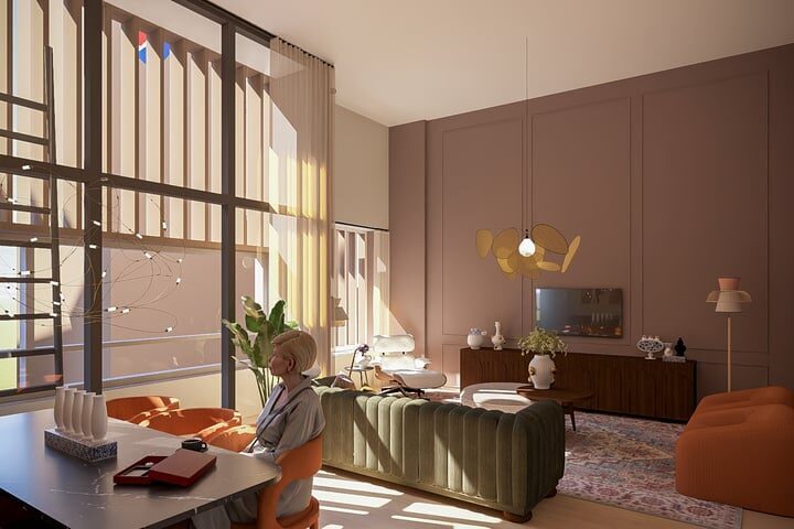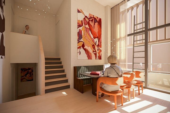 Aan de voorkant van het wooncomplex ervaar je de bruisende stad. Achter de monumentale gevel beleef je een oase van rust, dankzij de sfeervolle binnentuin, binnenhof en de groendaken; het beste van twee werelden. In deze binnentuin bevinden zich ook je eigen buitenberging en de parkeerplaatsen.