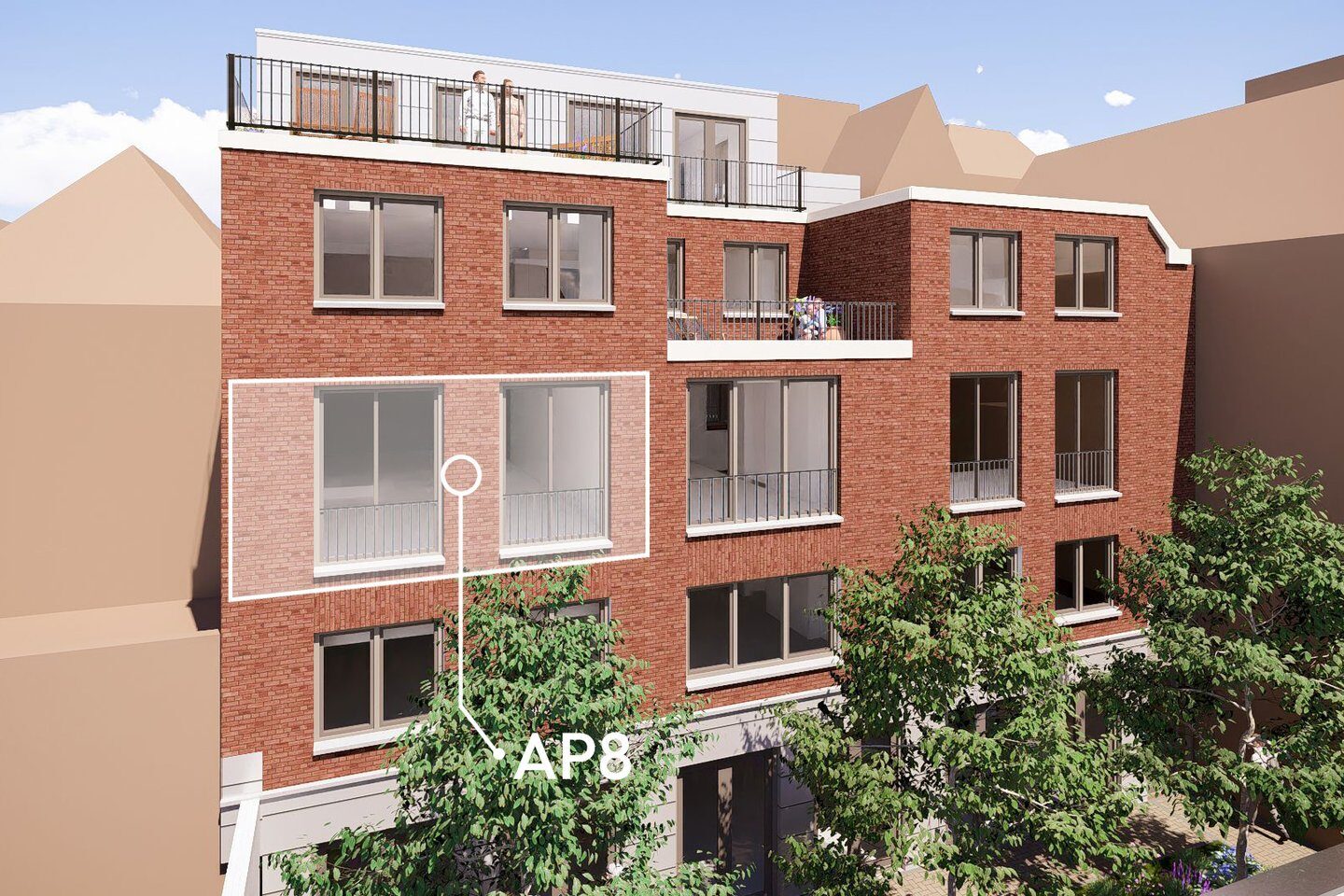 Uitkijkend over de groene binnentuin. Nu kopen=in zomer 2026 wonen.
