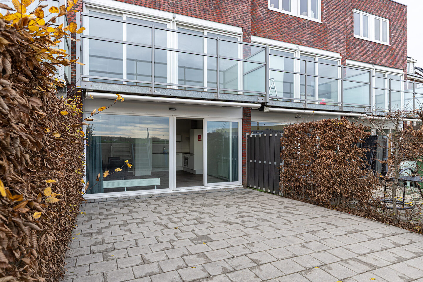 De achtertuin is gunstig gelegen op het zuidoosten en beschikt over een deels overdekt terras en via een trapje bereik je de dijk, die toegang biedt tot het water en de aanlegsteigers. Het gebruik van de dijk tot aan het water is toegestaan. Zowel de achtertuin als de aangrenzende dijk zijn eigendom van het Waterschap.