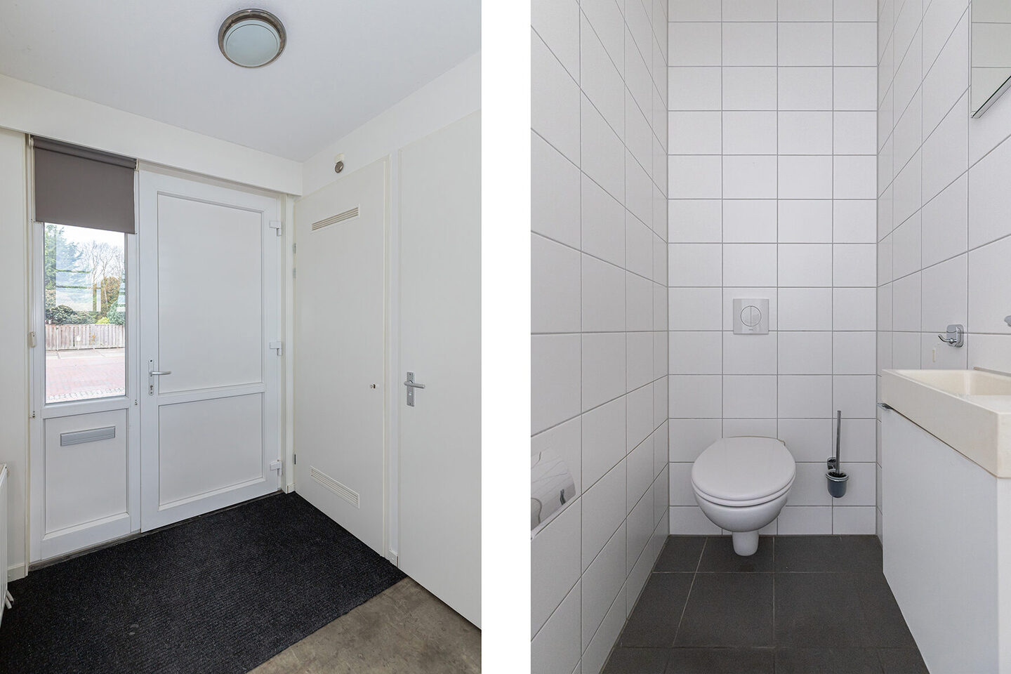 De entree bevindt zich op dijkniveau. Bij binnenkomst kom je in een ruime hal met toegang tot de toiletruimte, de meterkast en de inpandige berging. De indeling is praktisch en doordacht, met volop bergruimte direct bij binnenkomst.