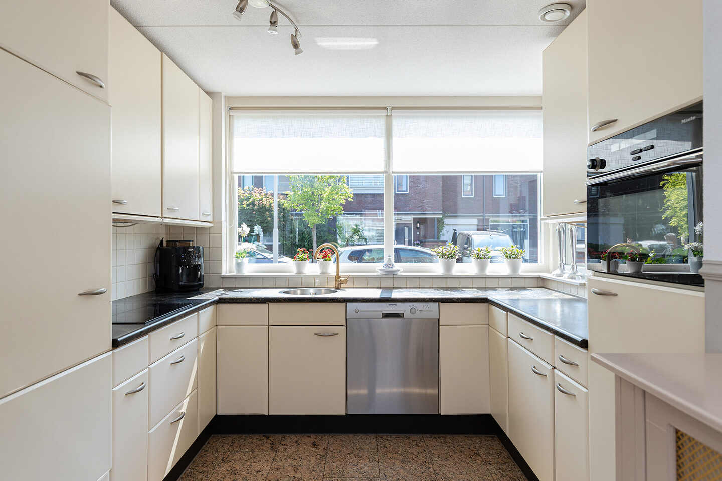De open keuken aan de voorzijde van de woning biedt vrij uitzicht over de straat en is uitgevoerd in een praktische U-opstelling. De vanillekleurige keukenkasten worden gecombineerd met een zwart gemêleerd werkblad. De keuken is uitgerust met een keramische kookplaat, een afzuigkap, een oven, een vaatwasser en een koelkast.