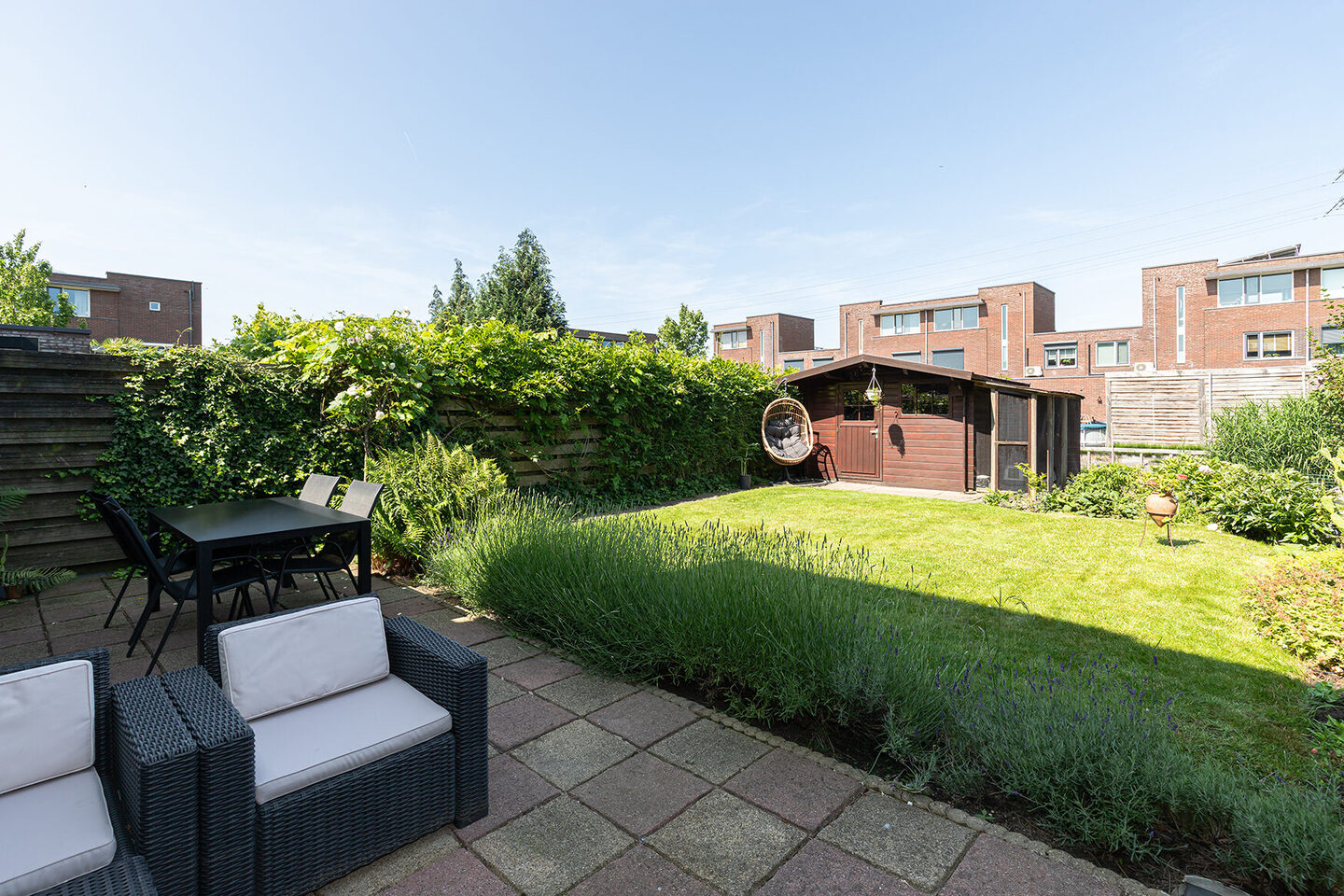 De achtertuin is een heerlijke plek om te ontspannen: verzorgd aangelegd met een betegeld onderheid terras aan de woning (volledig voorzien van zonwering), een ruim gazon, borders met volwassen beplanting en een houten berging (3 x 2.5 meter) met elektra. Achterin de tuin vindt u een extra terras aan een watertje, perfect voor lange zomeravonden.