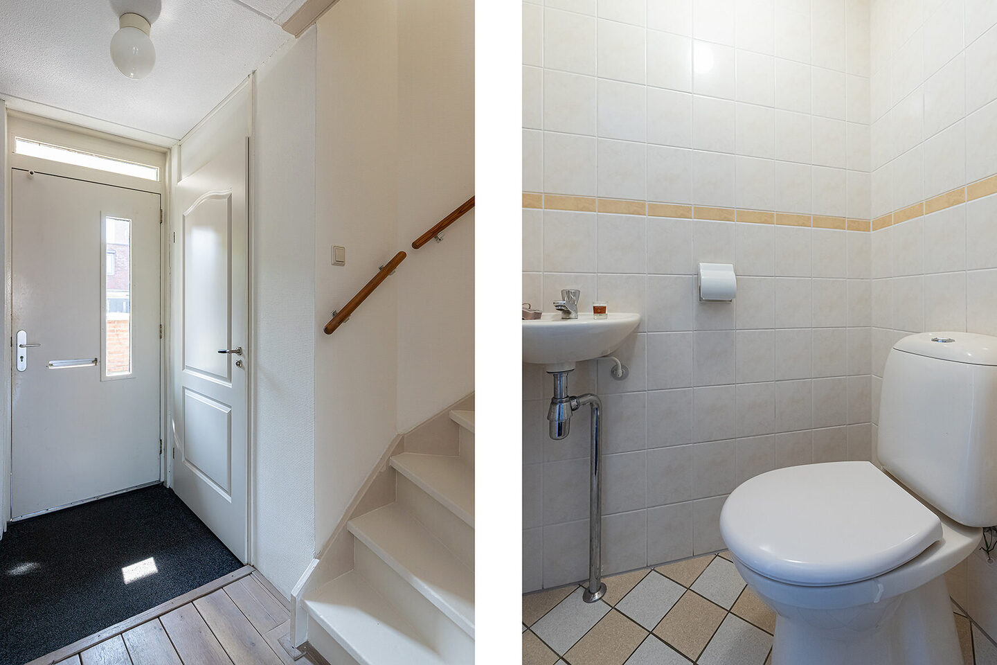 Via de verzorgde voortuin bereikt u de lichte entree, die toegang biedt tot de toiletruimte, de trapopgang naar de eerste verdieping en de ruime woonkamer. De toiletruimte is volledig betegeld en voorzien van een fonteintje.
