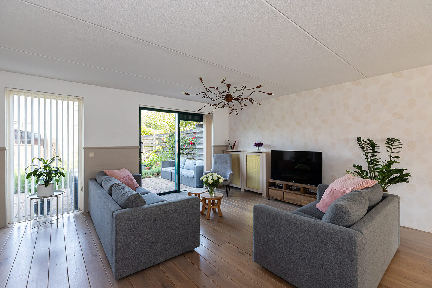 De woonkamer is speels ingedeeld in een royale L-opstelling met grote raampartijen die zorgen voor veel daglicht. Aan de achterzijde bieden een schuifpui én een aparte deur directe toegang tot de tuin. De tuinzijde van de woonkamer is voorzien van zonwering en onder de trap bevindt zich een trapkast.
