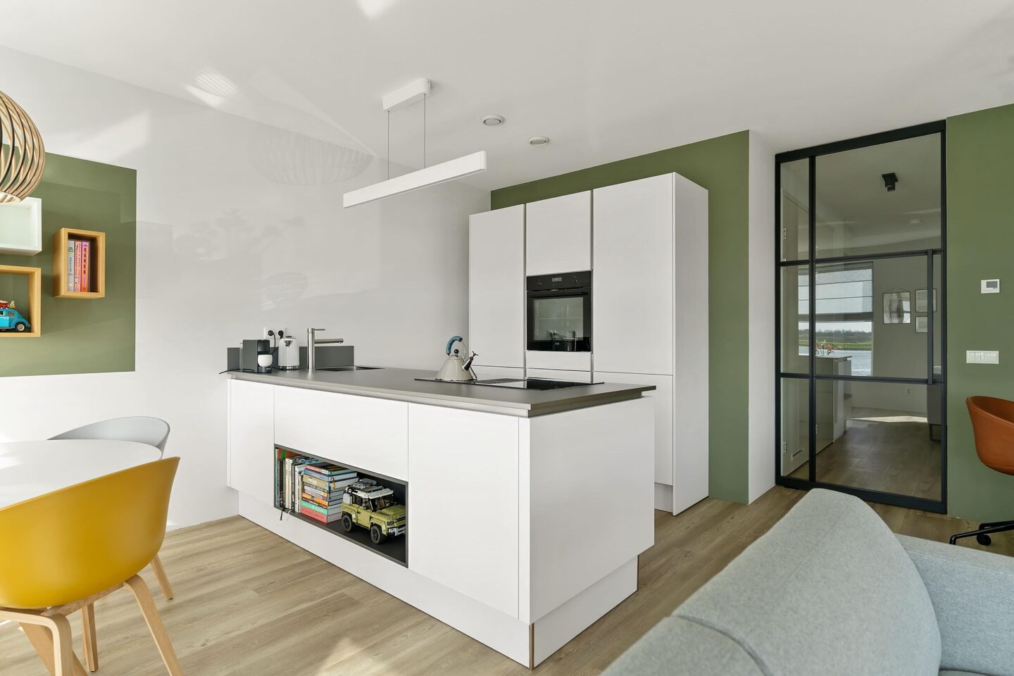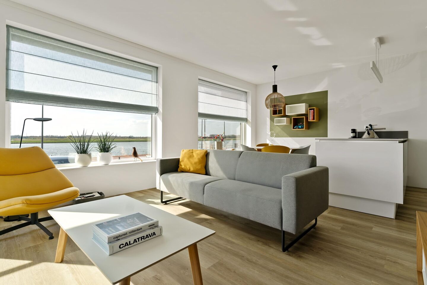 Binnen ervaar je direct een prettige sfeer. De woonkamer is licht en verzorgd, met een moderne afwerking die zorgt voor een frisse uitstraling. De grote schuifpui maakt het verschil: deze opent de ruimte volledig richting het balkon en haalt buiten naar binnen. Op mooie dagen zet je de pui open en wordt het balkon een verlengstuk van je woonkamer – een plek waar je net zo makkelijk de dag begint als afsluit met uitzicht op het water.