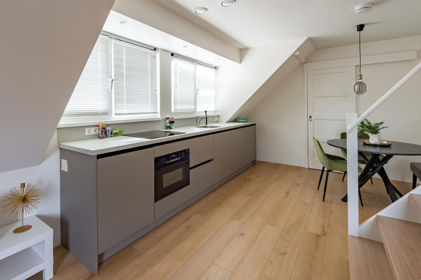 De keuken in rechte opstelling is van alle gemakken voorzien, zoals een inductiekookplaat, vaatwasser, combi-oven, koelkast met vriesvak en voldoende bergruimte. Vanuit de keuken is er zicht op de tuin en de Kerkstraat.