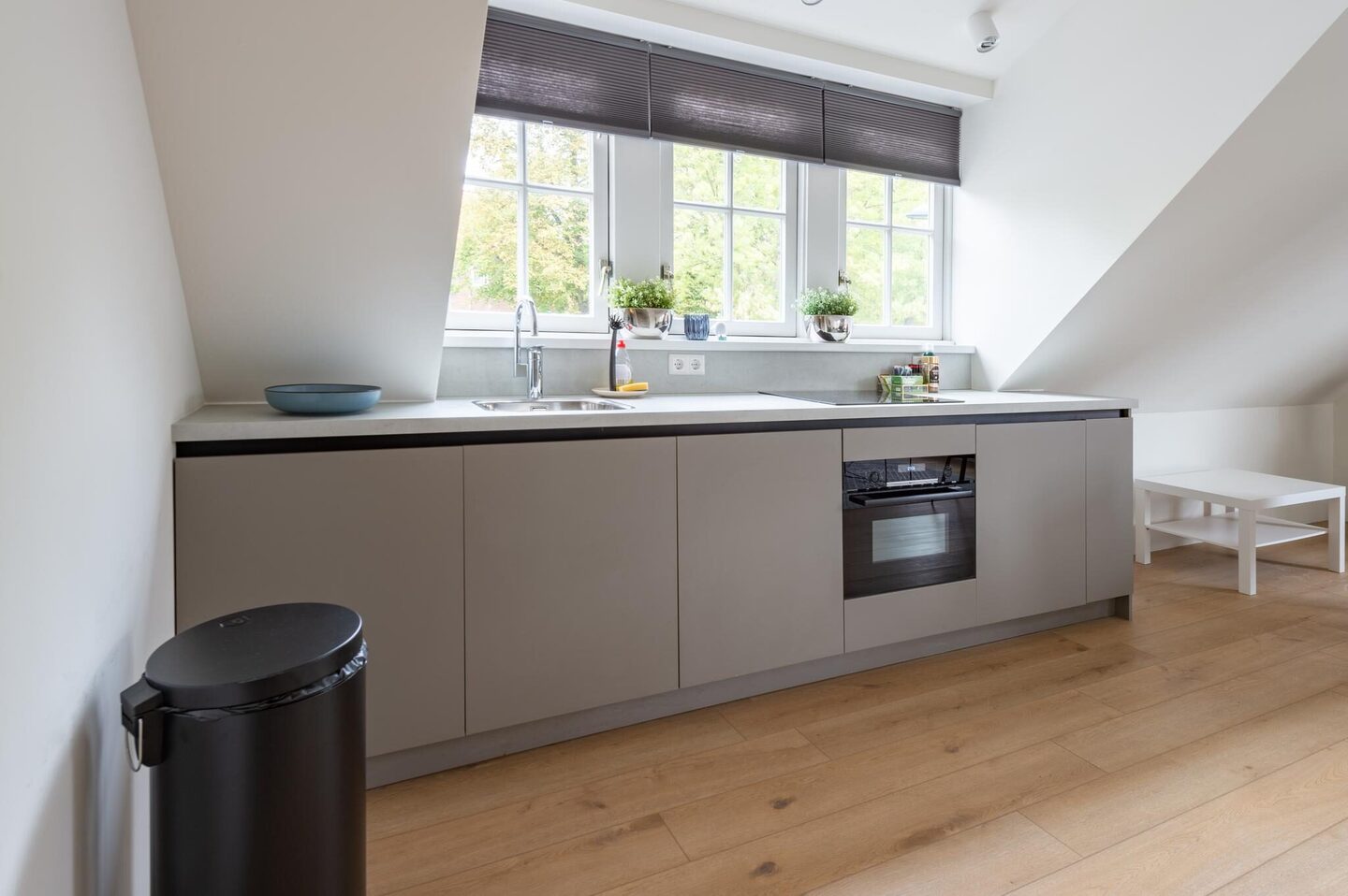 De keuken in rechte opstelling is van alle gemakken voorzien, zoals een inductiekookplaat, vaatwasser, combi-oven, koelkast met vriesvak en voldoende bergruimte. Vanuit de keuken is er toegang tot de badkamer en de trap naar de slaapkamer.