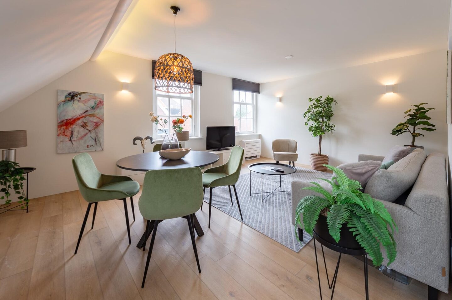Speelse woon- en eetkamer met open keuken. De woonkamer ligt de voorzijde van de woning en is voorzien van een neutrale laminaat vloer en een gezellige zithoek met tv.