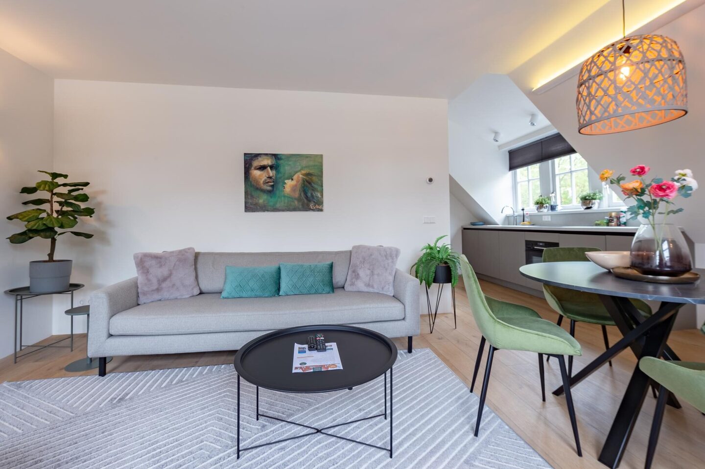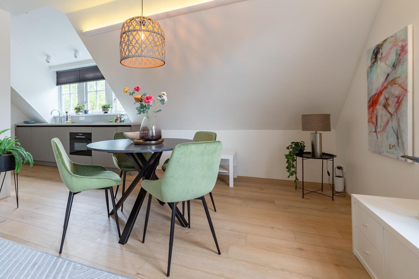 The modern kitchen is fully equipped with an induction hob, dishwasher, combi oven, fridge with freezer compartment and ample storage space. From the kitchen there is access to the bathroom and the staircase leading to the bedroom.