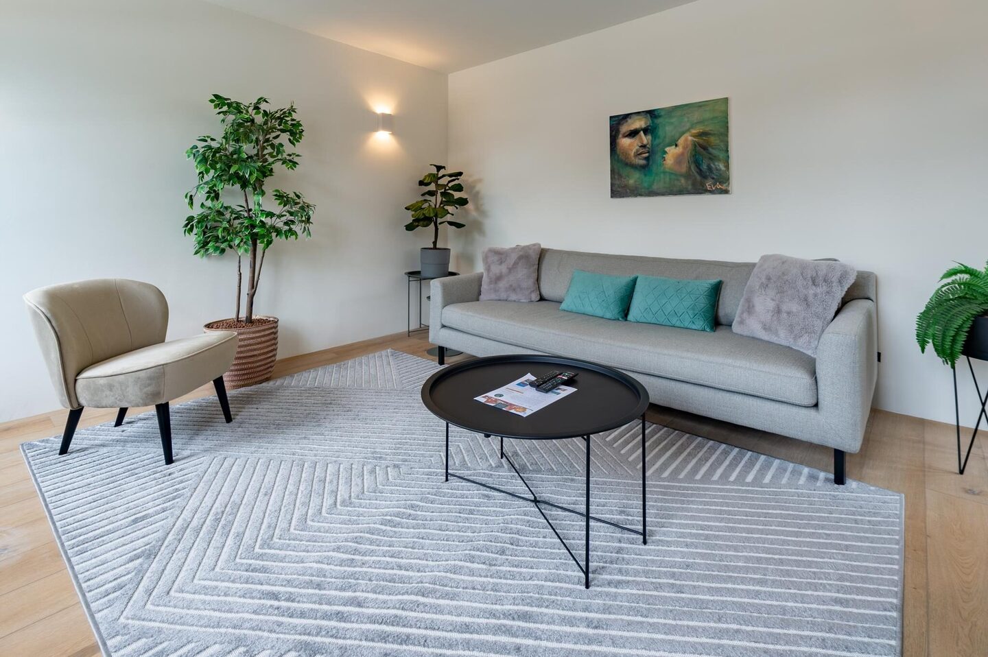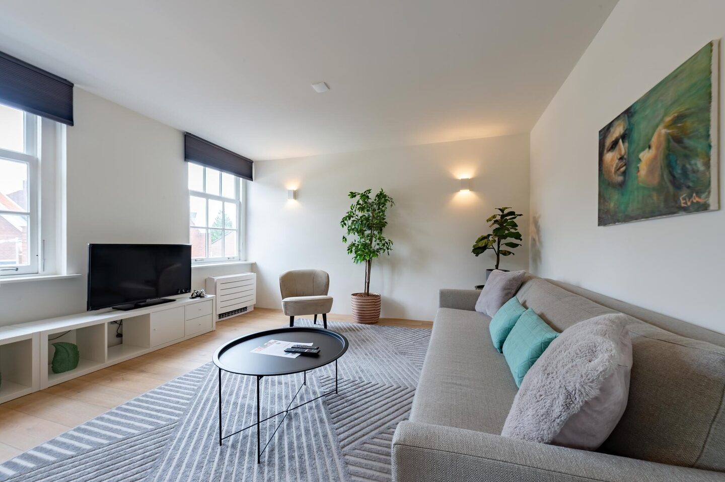 The apartment has a living area of 63 m² and features a cosy living room, one bedroom with two sleeping places, a modern kitchen and bathroom. The entire apartment is equipped with underfloor heating and air conditioning in both the living room and bedroom. The property is rented out fully furnished and upholstered.