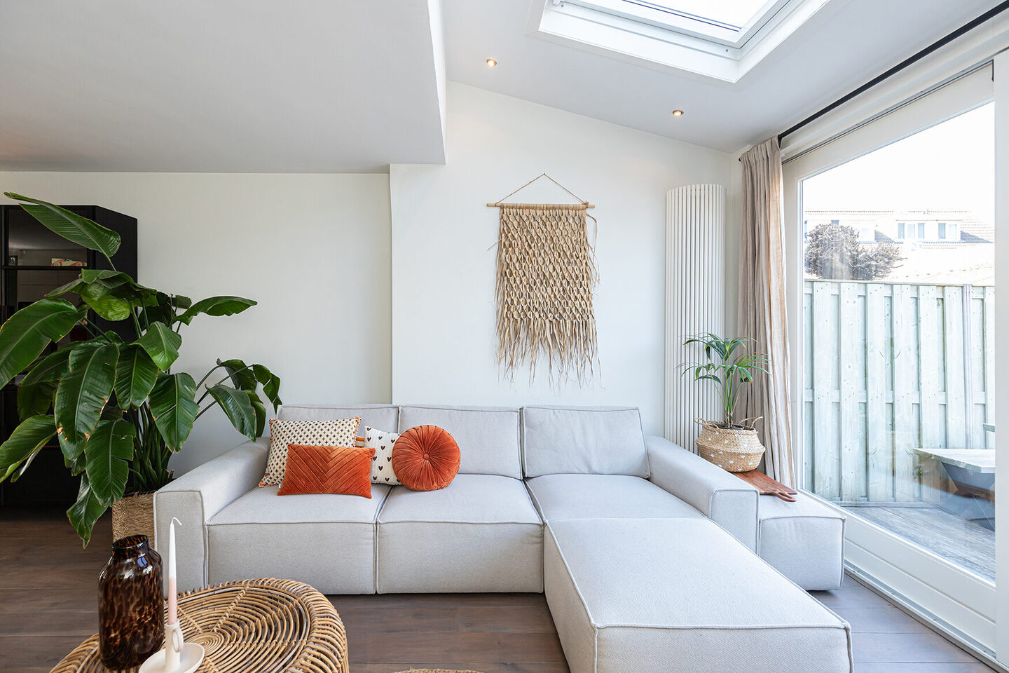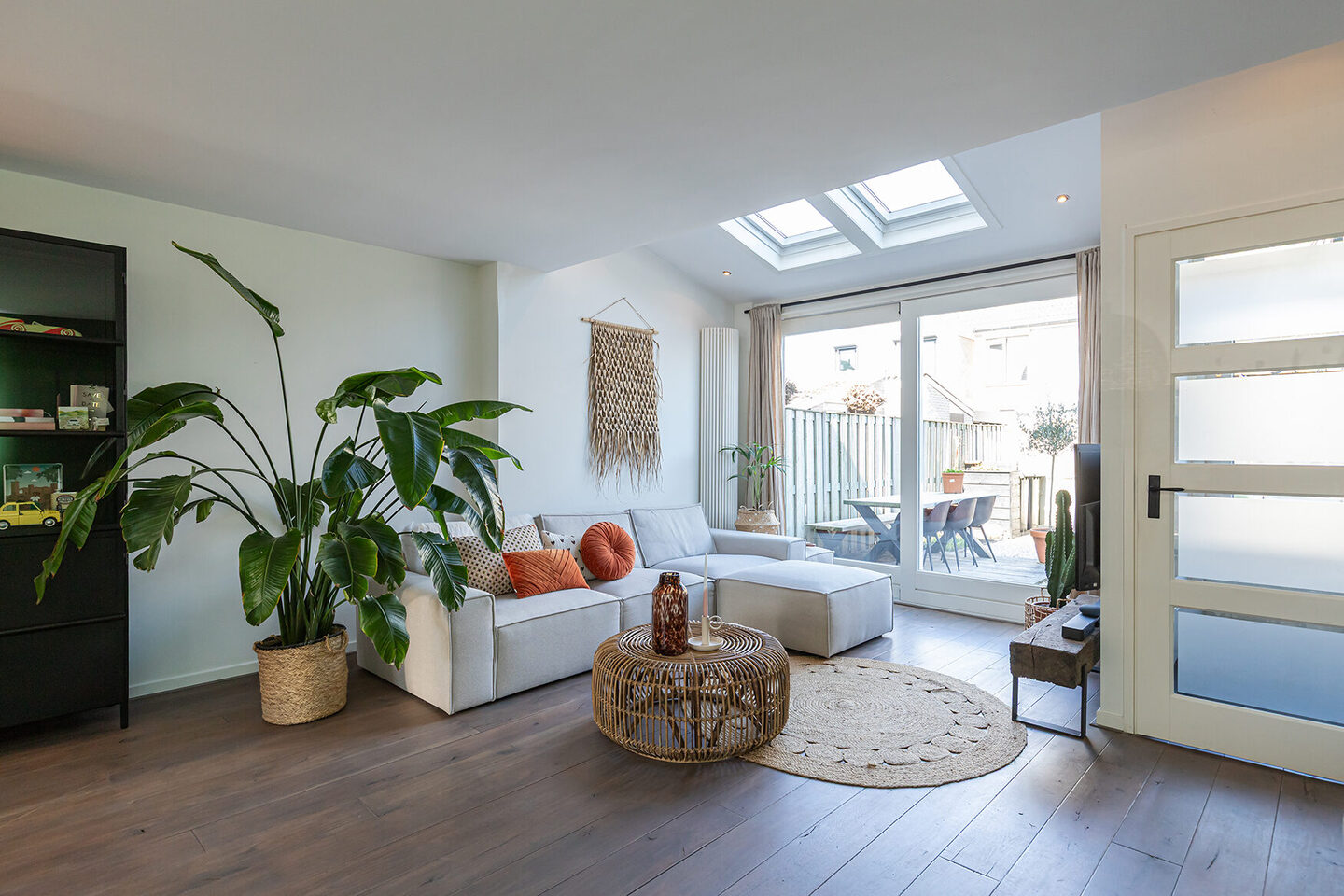 Via een fraaie zwartglazen deur kom je in de royale en lichte woonkamer. De aanbouw aan de achterzijde, de grote schuifpui én de dakramen zorgen voor een zee aan daglicht en een mooie verbinding met buiten. Het tochtportaal maakt dat je zelfs op koudere dagen comfortabel naar de tuin kunt.