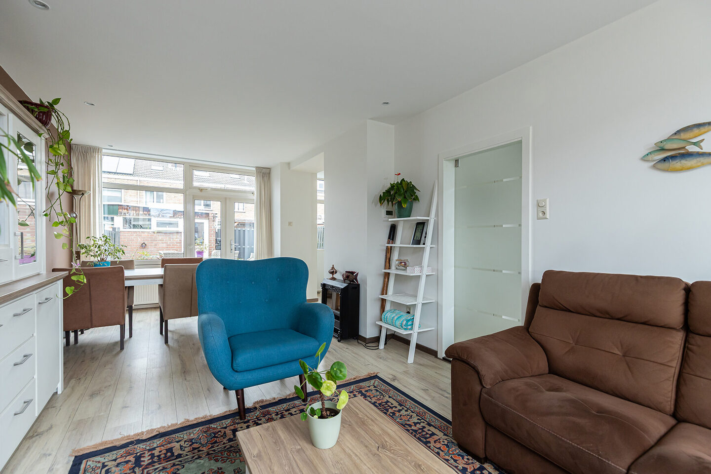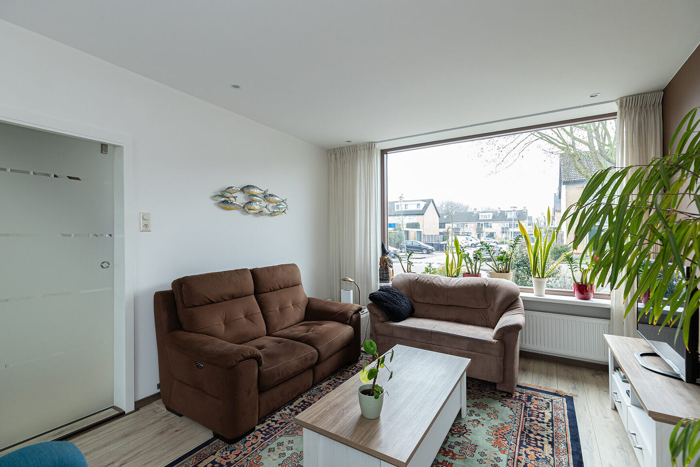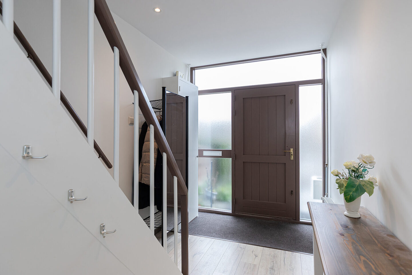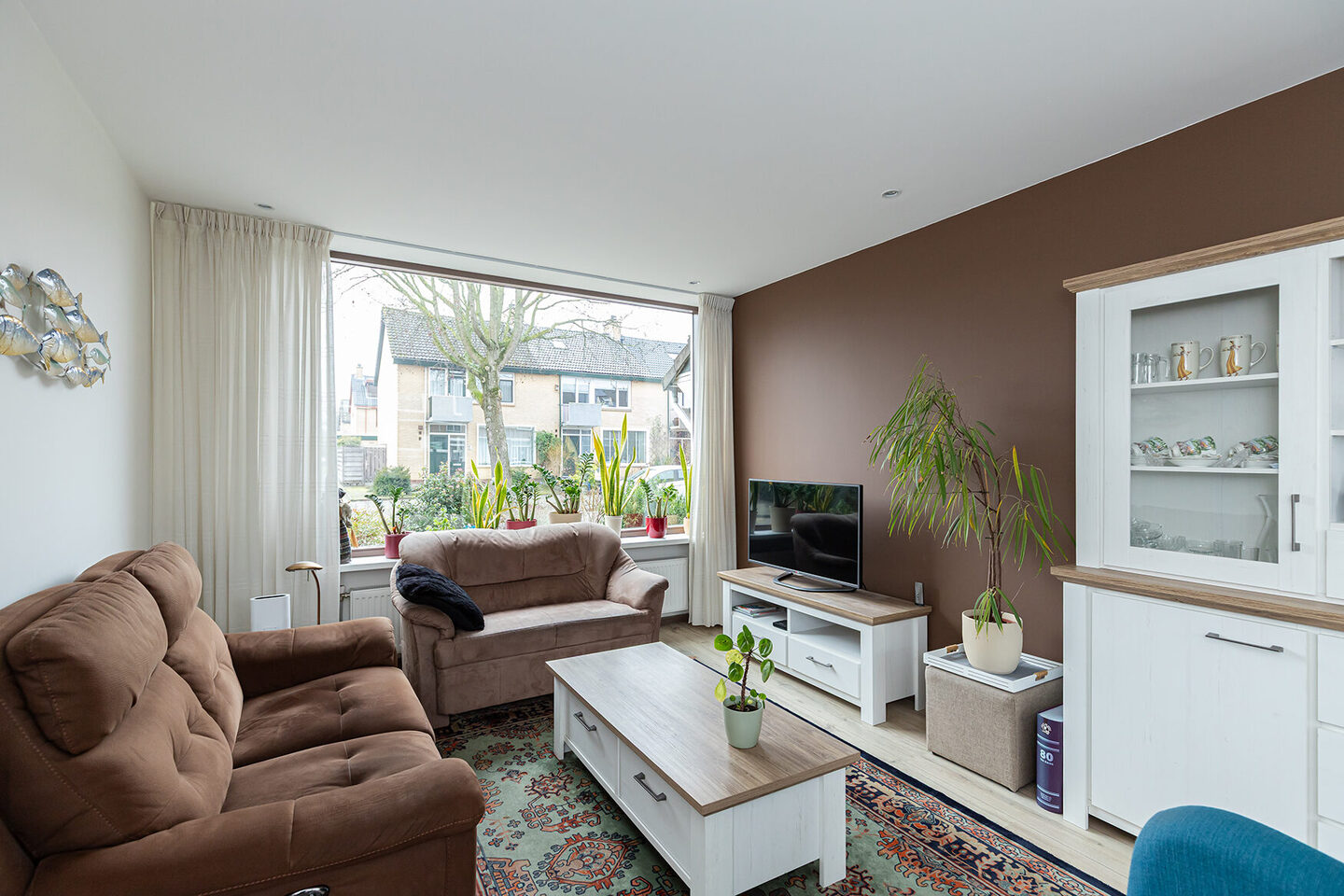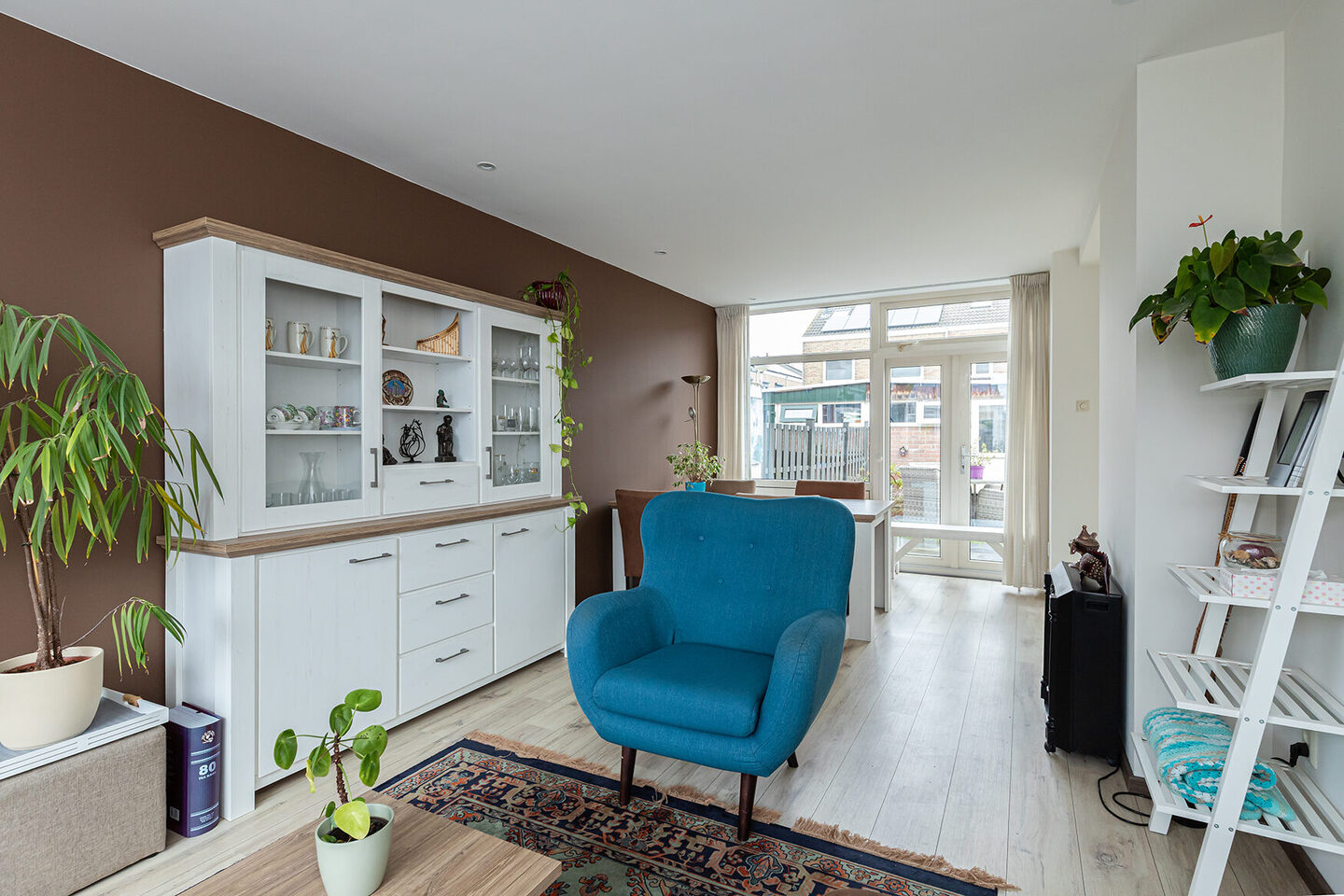 De ruime hal geeft toegang tot de meterkast, de toiletruimte en de trap naar de verdieping. De doorzonwoonkamer is heerlijk licht dankzij de grote ramen en beschikt over openslaande deuren naar de achtertuin.