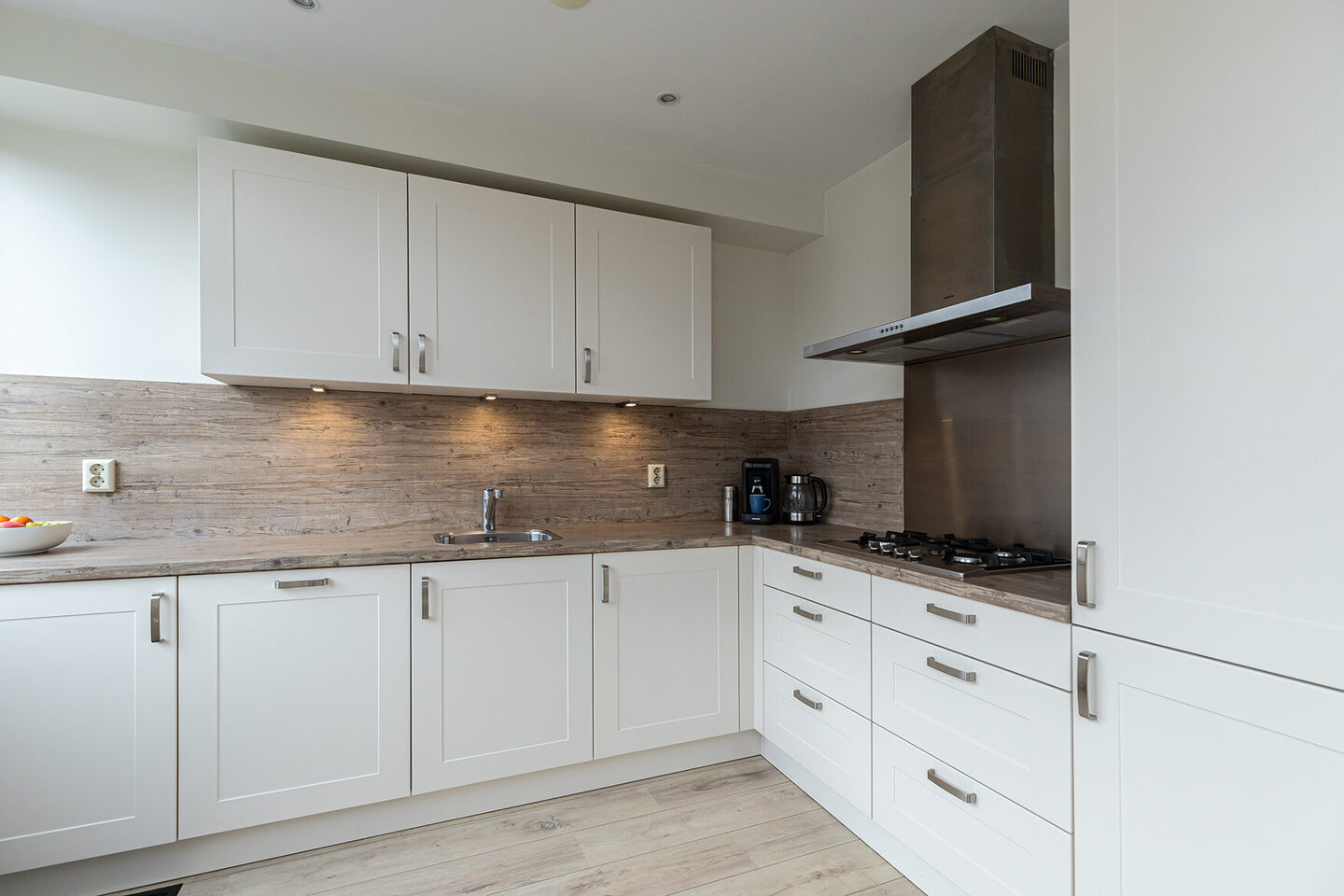 De half-open keuken is opgesteld in een praktische hoekopstelling en uitgevoerd in een magnolia kleurstelling met een donker kunststof werkblad (Nolte Eco Nalencia). De keuken is voorzien van een 4-pits kookplaat, combimagnetron, vaatwasser, koel-vriescombinatie en afzuigkap. Vanuit de keuken is er eveneens toegang tot de tuin.
