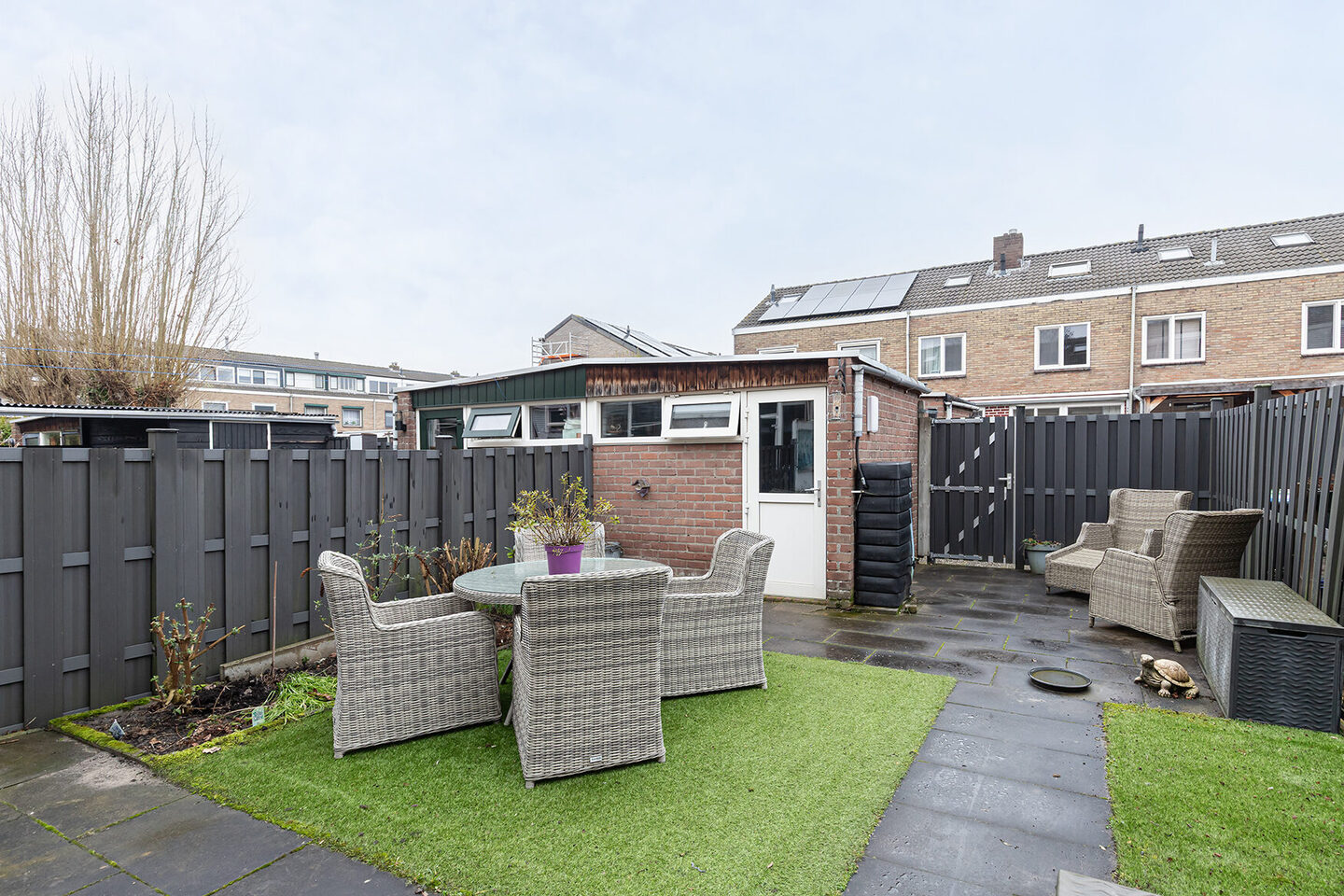 De voortuin is modern en strak aangelegd met een speels niveauverschil, antracietkleurige plantenbakken en gevarieerde beplanting. De achtertuin is fraai ingericht met sierbestrating, kunstgazon, een stenen berging met elektra en een praktische achterom.