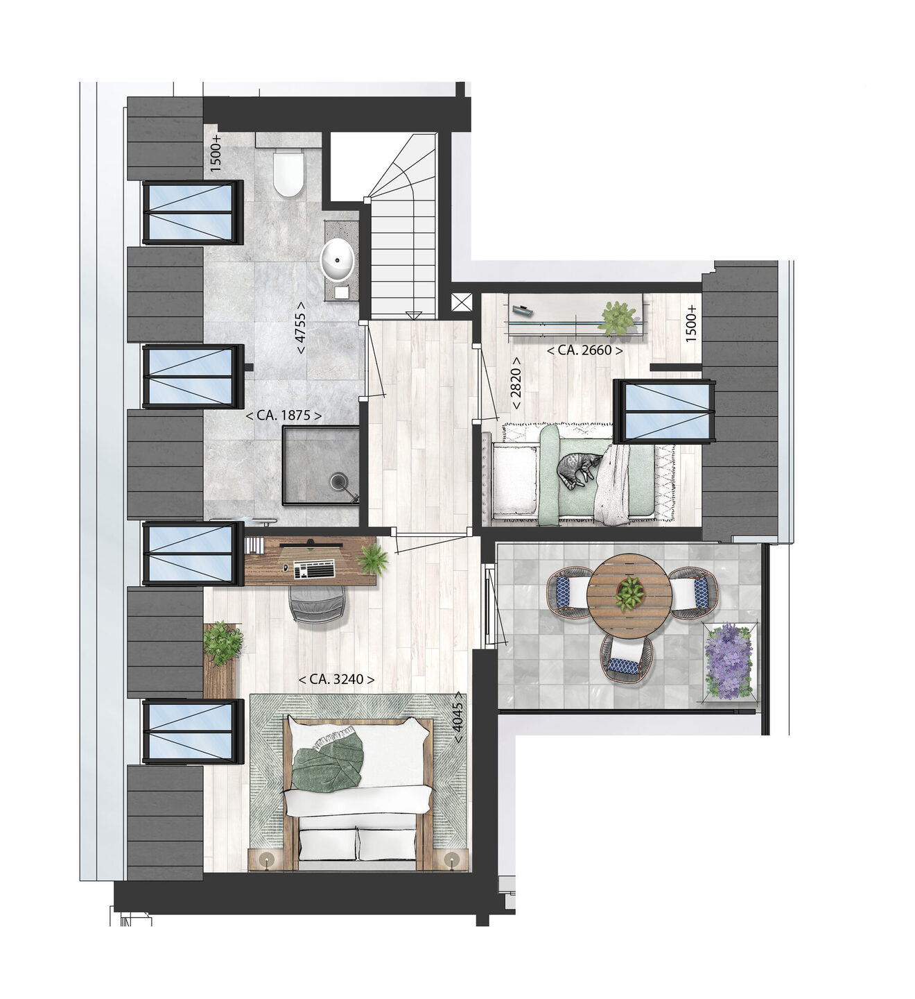 De eerste verdieping is ingericht als rustige privézone met twee goed bemeten slaapkamers en een complete badkamer. Deze badkamer is volledig uitgerust met een douche, wastafel, toilet en handdoekradiator. Vanuit één van de slaapkamers stapt u zo de loggia op: een beschutte buitenruimte van circa 6,3 m² waar u in alle rust kunt genieten van een kop koffie in de ochtend of een ontspannen moment aan het einde van de dag.
