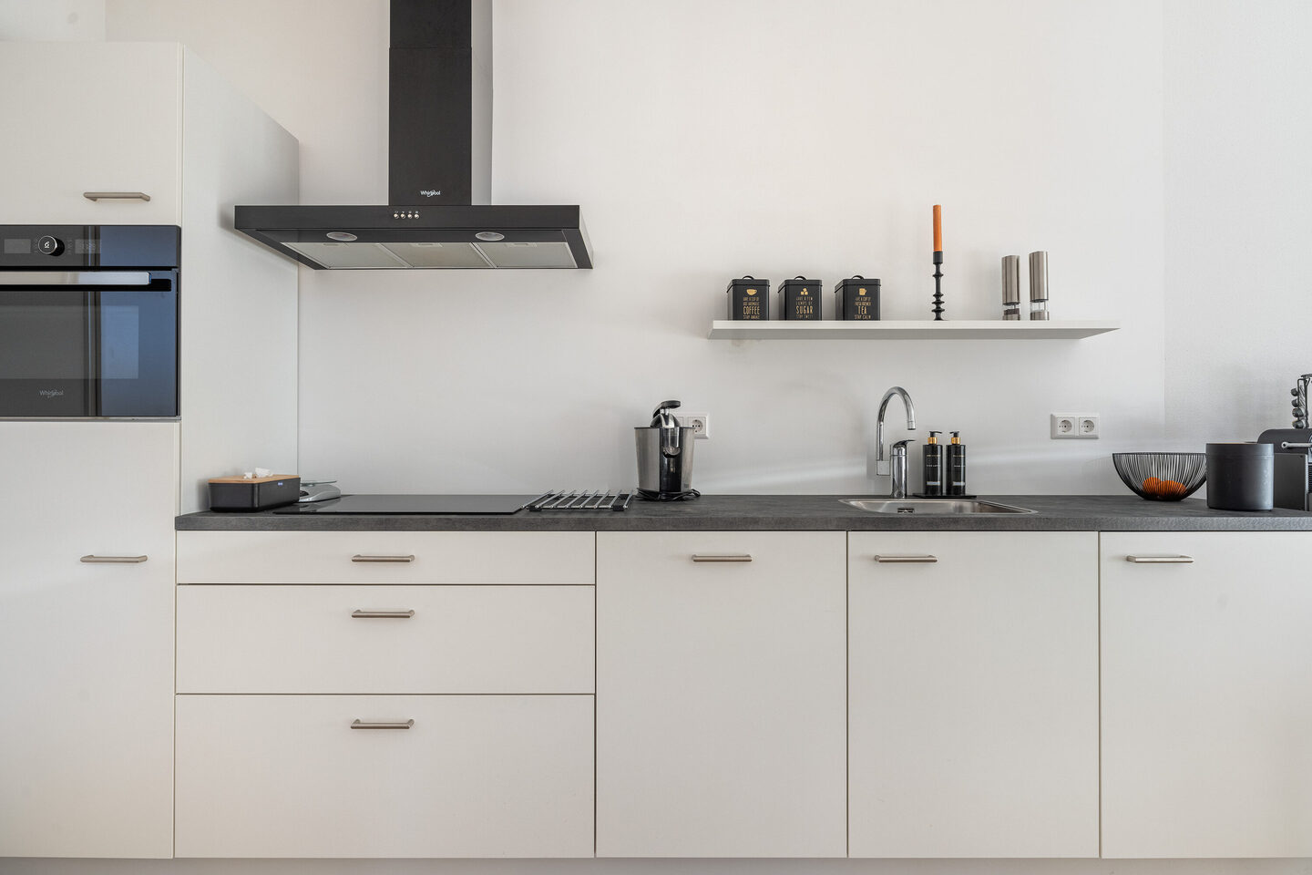 De moderne, open keuken is voorzien van een inductiekookplaat, afzuiginstallatie, koel-vriescombinatie, combimagnetron en een vaatwasmachine.