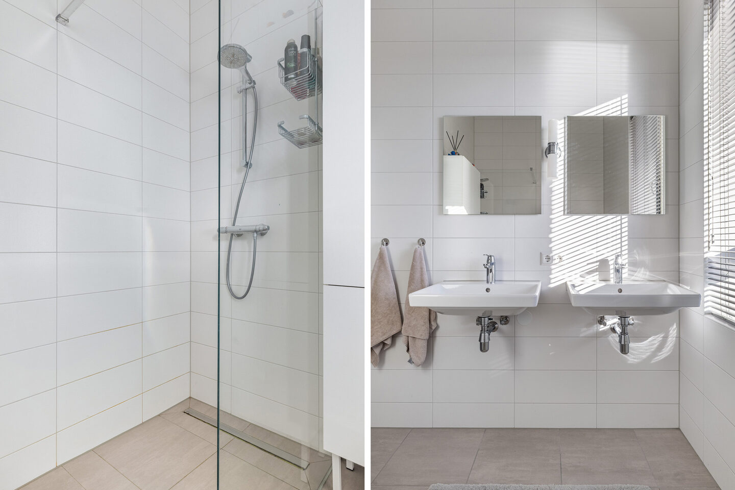 De volledig betegelde en luxe badkamer is voorzien van een inloopdouche, dubbele wastafel en een handdoek designradiator.