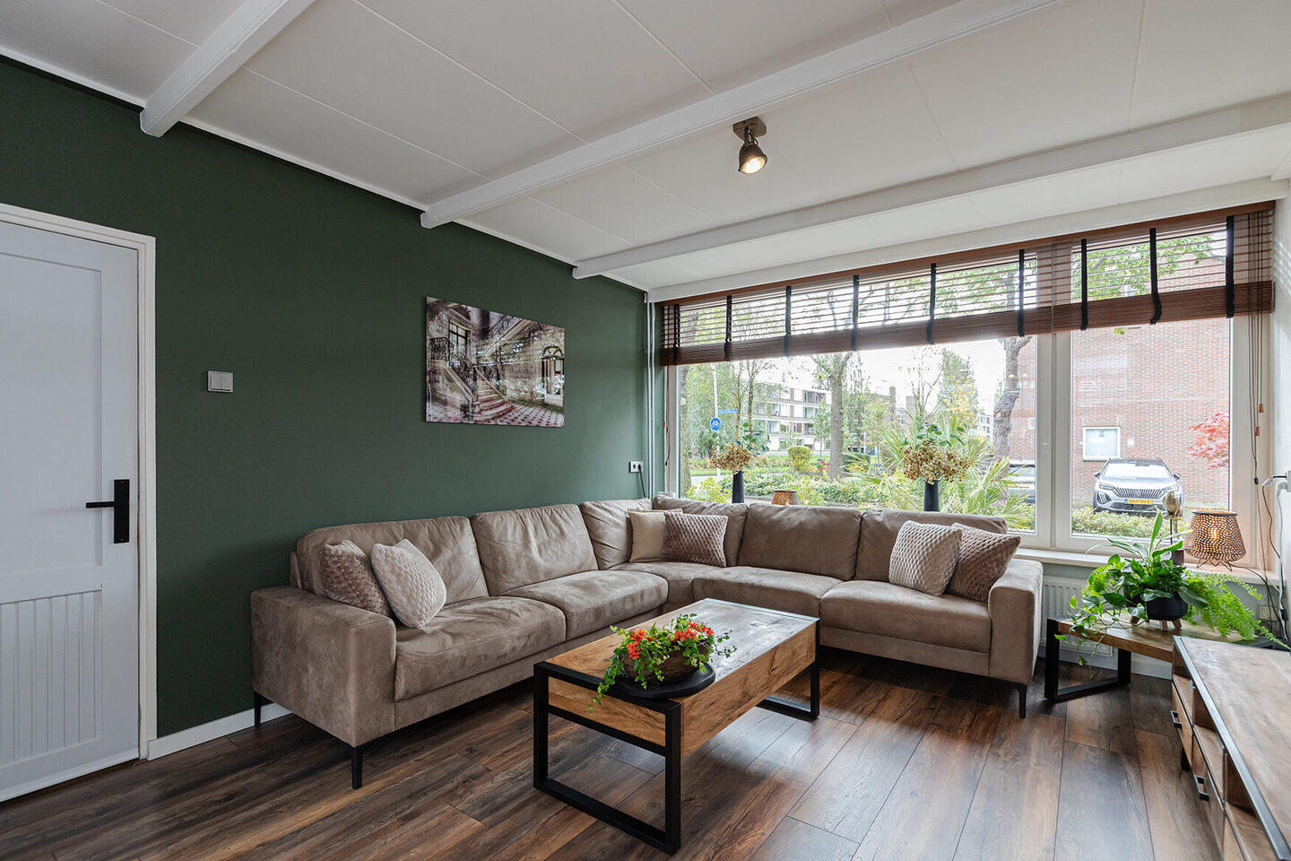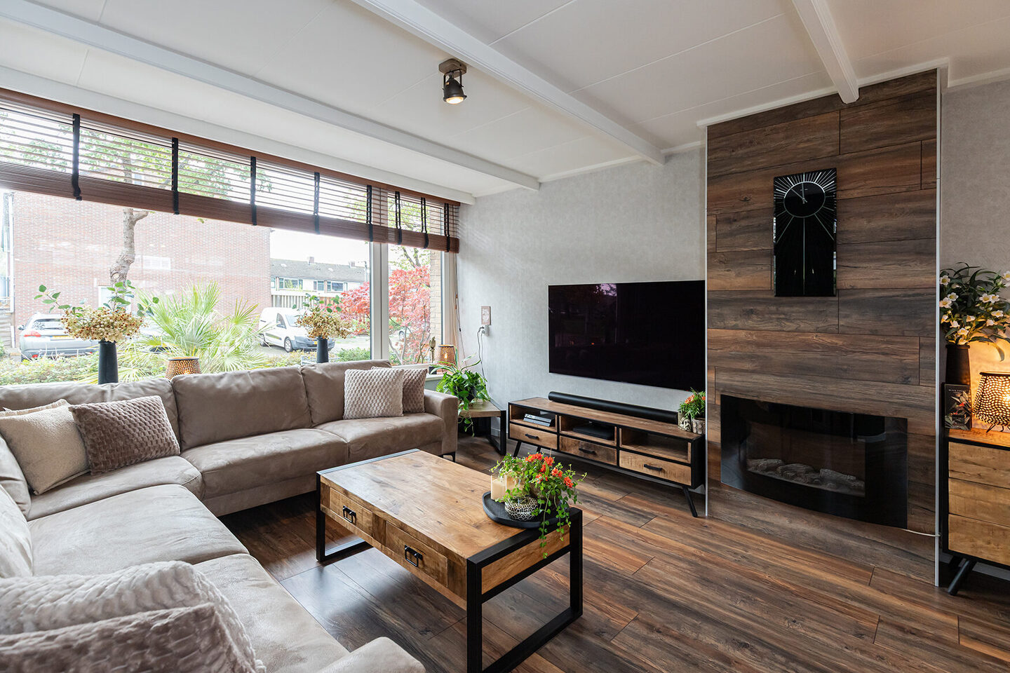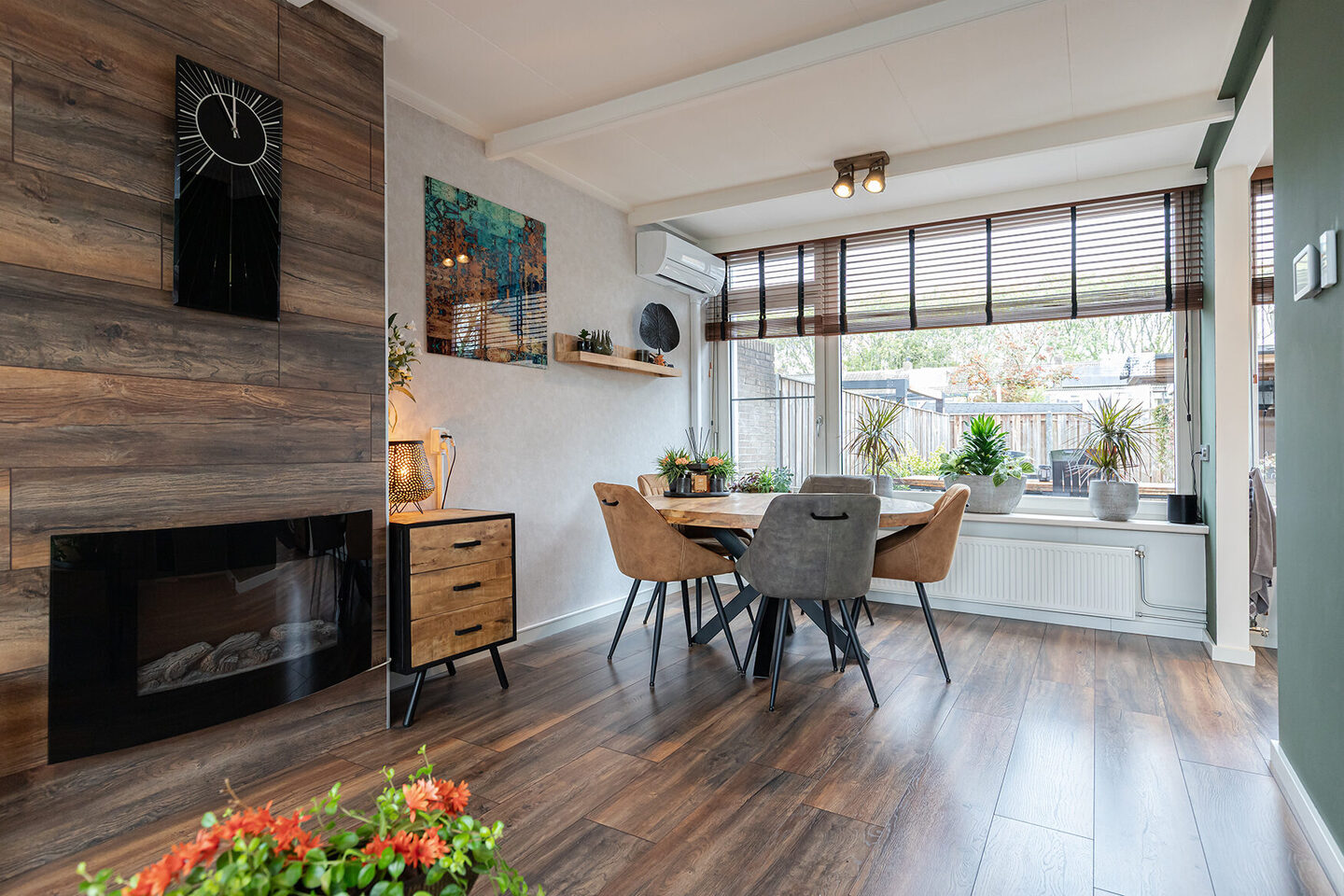 De stijlvolle entree met rustieke laminaatvloer geeft toegang tot de meterkast, trapkast en toiletruimte met een frisse zwart-witte betegeling. De doorzonwoonkamer is een lichte en prettige leefruimte met grote ramen aan beide zijden, een mooie laminaatvloer en een moderne elektrische wandkachel die voor extra sfeer zorgt. Daarnaast is er airconditioning aanwezig.