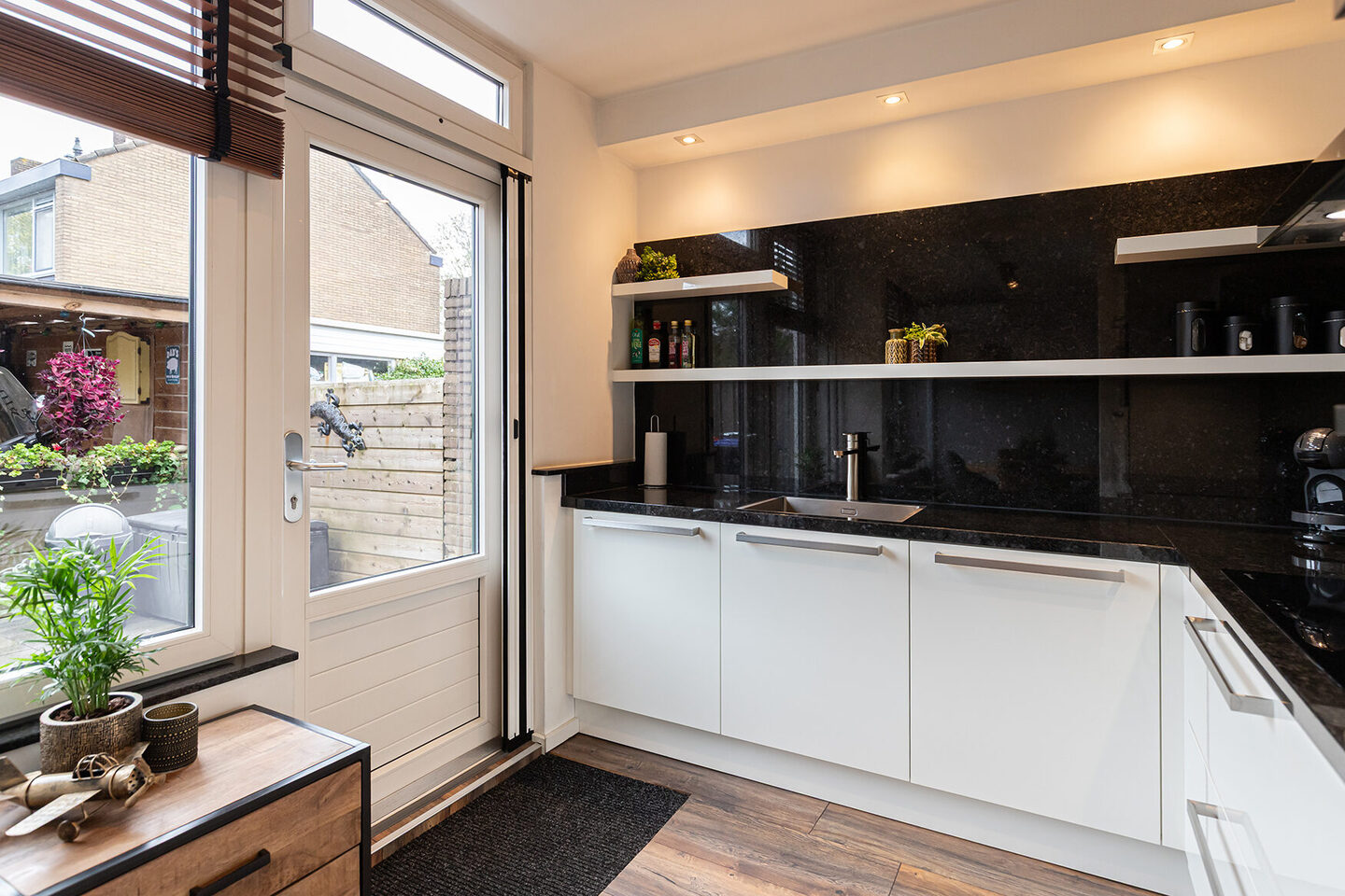 De halfopen keuken is modern en luxe ingericht met een witte keukeninrichting, afgewerkt met een zwart natuurstenen werkblad en achterwand. De doordacht geplaatste witte wandplanken zorgen voor extra opbergruimte en een stijlvolle uitstraling. De keuken is voorzien van een inductiekookplaat, combimagnetron/oven, koelkast en afzuigkap. In de koof zijn inbouwspotjes verwerkt die zorgen voor prettig werklicht. Via de keukendeur is de tuin bereikbaar.