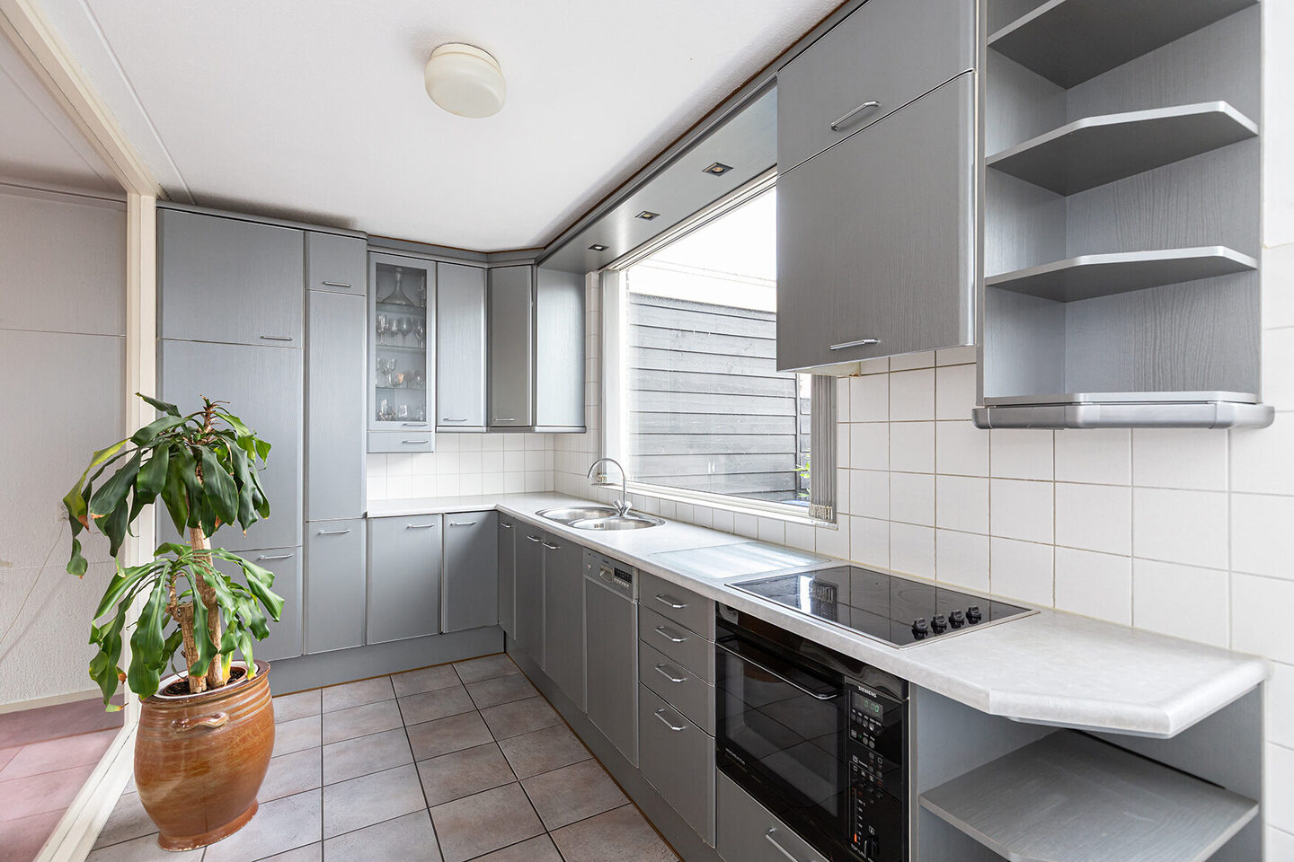 De keuken strekt zich uit over de volledige breedte van de woning. De L-opstelling met grijze keukenkastjes en kunststof werkblad biedt veel werk- en opbergruimte. De keuken is uitgerust met een keramische kookplaat, combimagnetron, vaatwasser, afzuigkap, close-in boiler en een wasmachineaansluiting. Ook is er een trapkast aanwezig. Vanuit de keuken heeft u toegang tot de achtertuin.