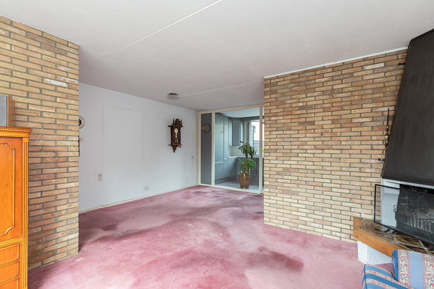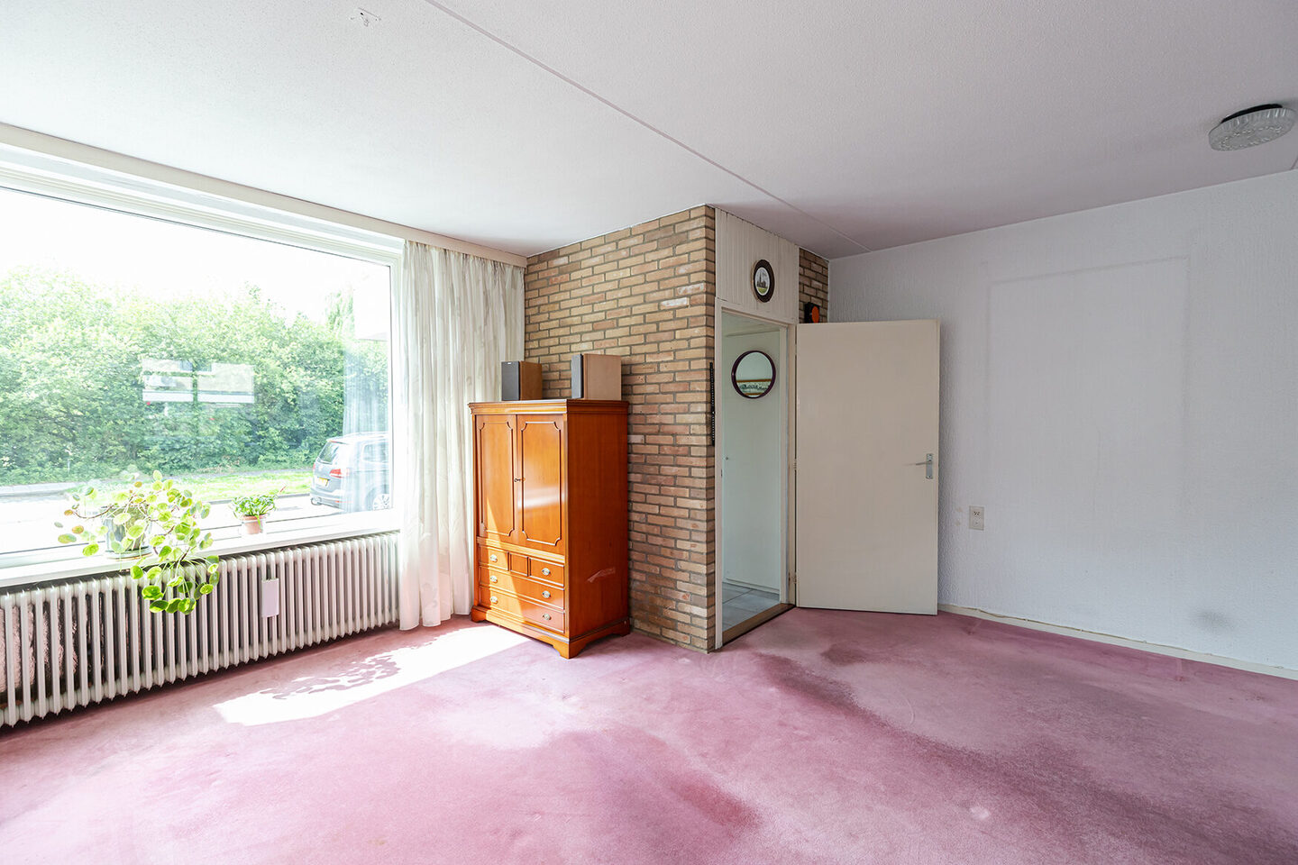 De entree biedt toegang tot de woonkamer en de meterkast. De woonkamer is ingericht in een Z-opstelling, waardoor er een natuurlijke verdeling ontstaat tussen het zitgedeelte aan de voorzijde bij de open haard en het eetgedeelte aan de achterzijde naast de afgesloten keuken. Dankzij de grote raampartijen geniet deze ruimte van veel lichtinval.