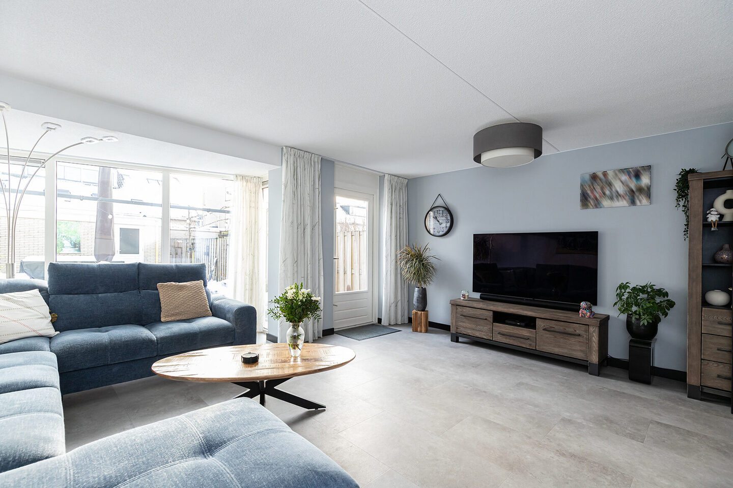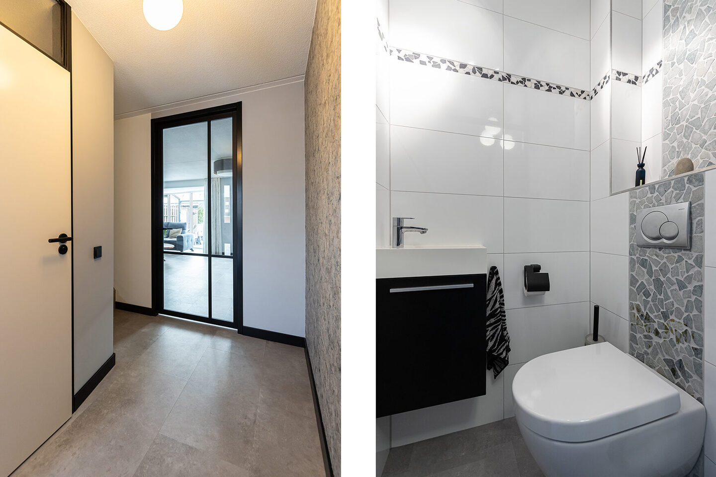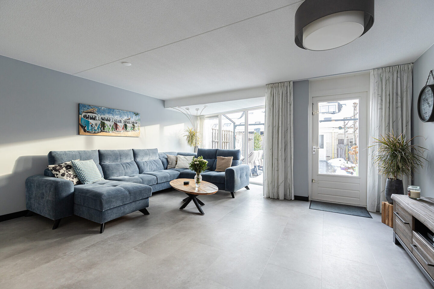 De royale woonkamer is heerlijk licht, mede door de gezellige erker aan de achterzijde. De grote zwartstalen glazen deur naar de woonkamer geeft het geheel een moderne en stijlvolle uitstraling. Een openslaande deur verbindt de woonkamer met de tuin en maakt het plaatje compleet. Een praktische trapkast zorgt voor verrassend veel bergruimte.