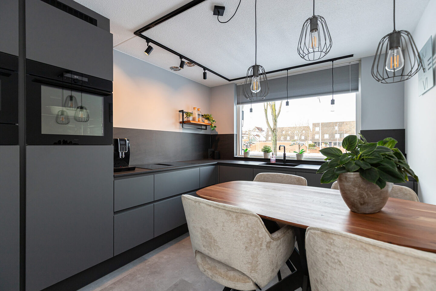 Aan de voorzijde van de woning bevindt zich de open keuken, die in 2024 is vernieuwd en uitgevoerd in een luxe L-opstelling van Nolte. De kwartsgrijze kasten combineren fraai met het keramische werkblad in basalt black satin. Uiteraard is de keuken voorzien van alle wenselijke inbouwapparatuur, waaronder een inductiekookplaat met geïntegreerde afzuiging, Quooker, oven, combimagnetron, vaatwasser, koelkast en vriezer. Hier is bovendien voldoende ruimte voor een gezellige eethoek.