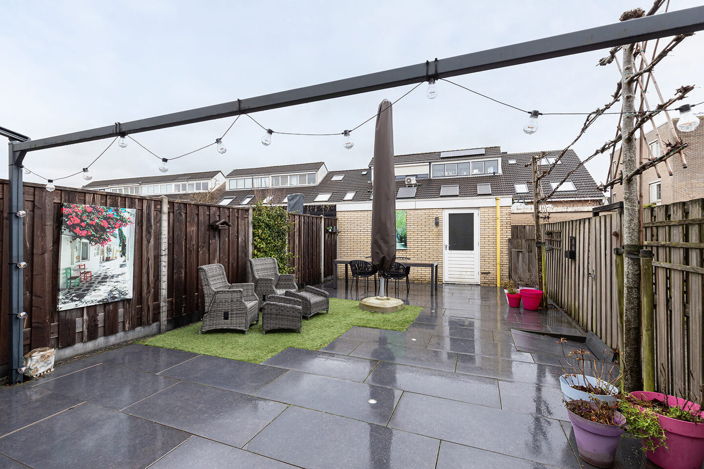 Ook de buitenruimten zijn met zorg ingericht. De voortuin is volledig betegeld en onderhoudsvriendelijk. De achtertuin is smaakvol aangelegd met een royaal terras, kunstgazon, gezellige buitenverlichting en twee leibomen, wat zorgt voor een groene en beschutte sfeer. De stenen berging is opvallend ruim, vergelijkbaar met een garage, en voorzien van elektra. Dankzij de eigen achterom is de tuin ook praktisch in gebruik.
