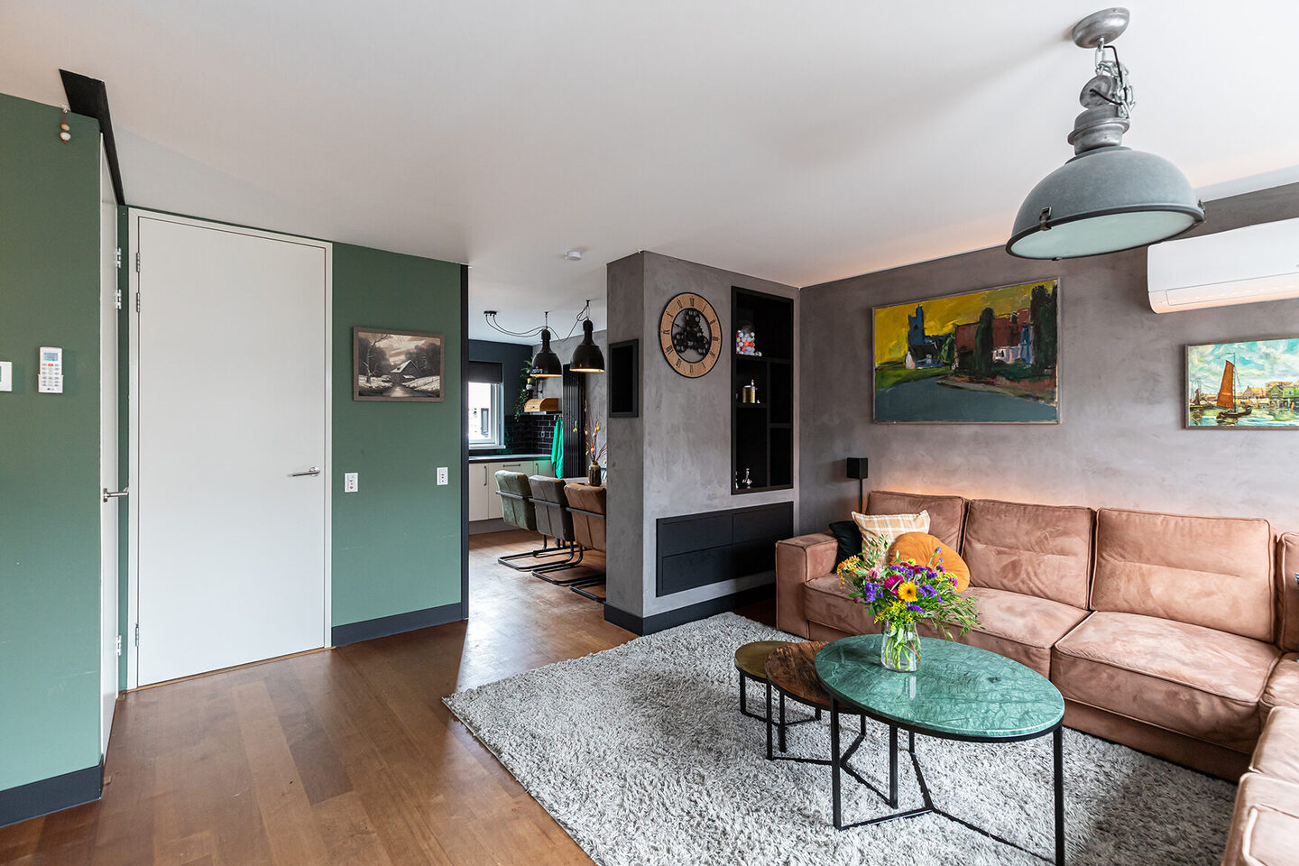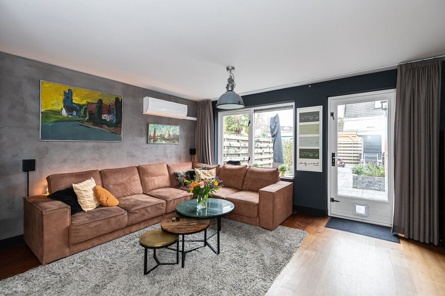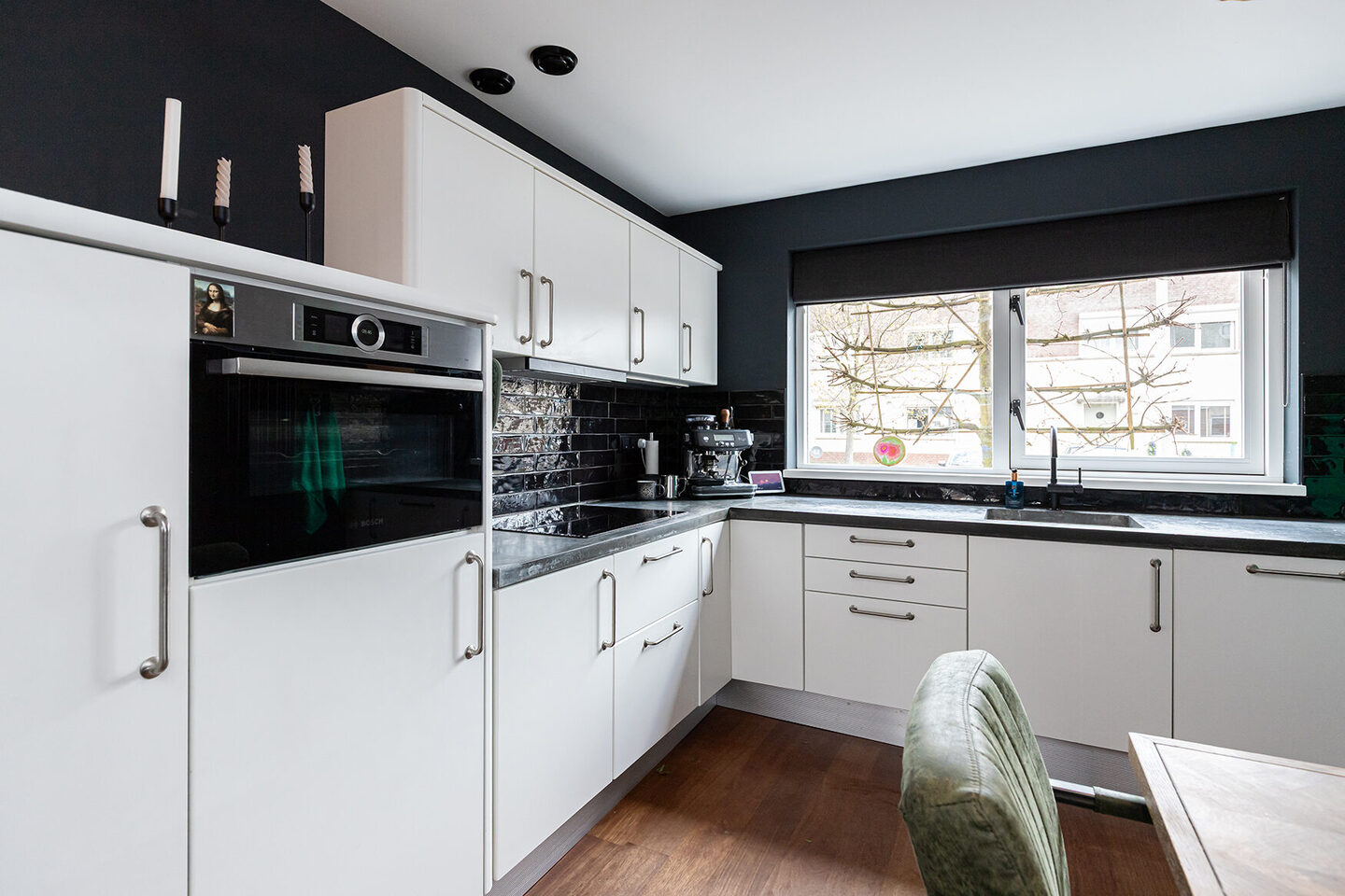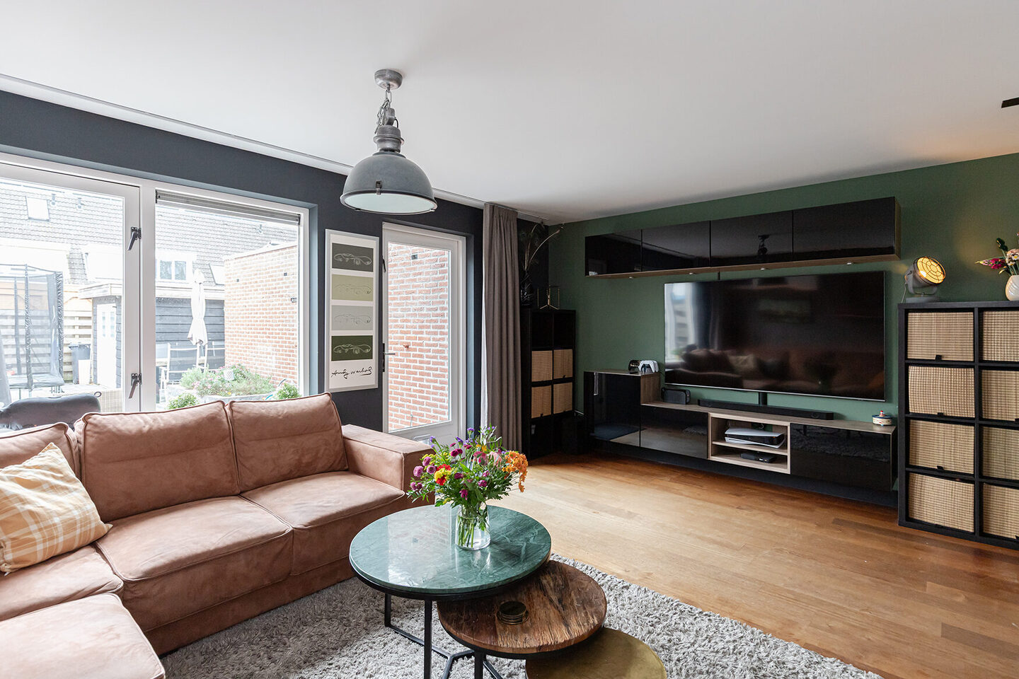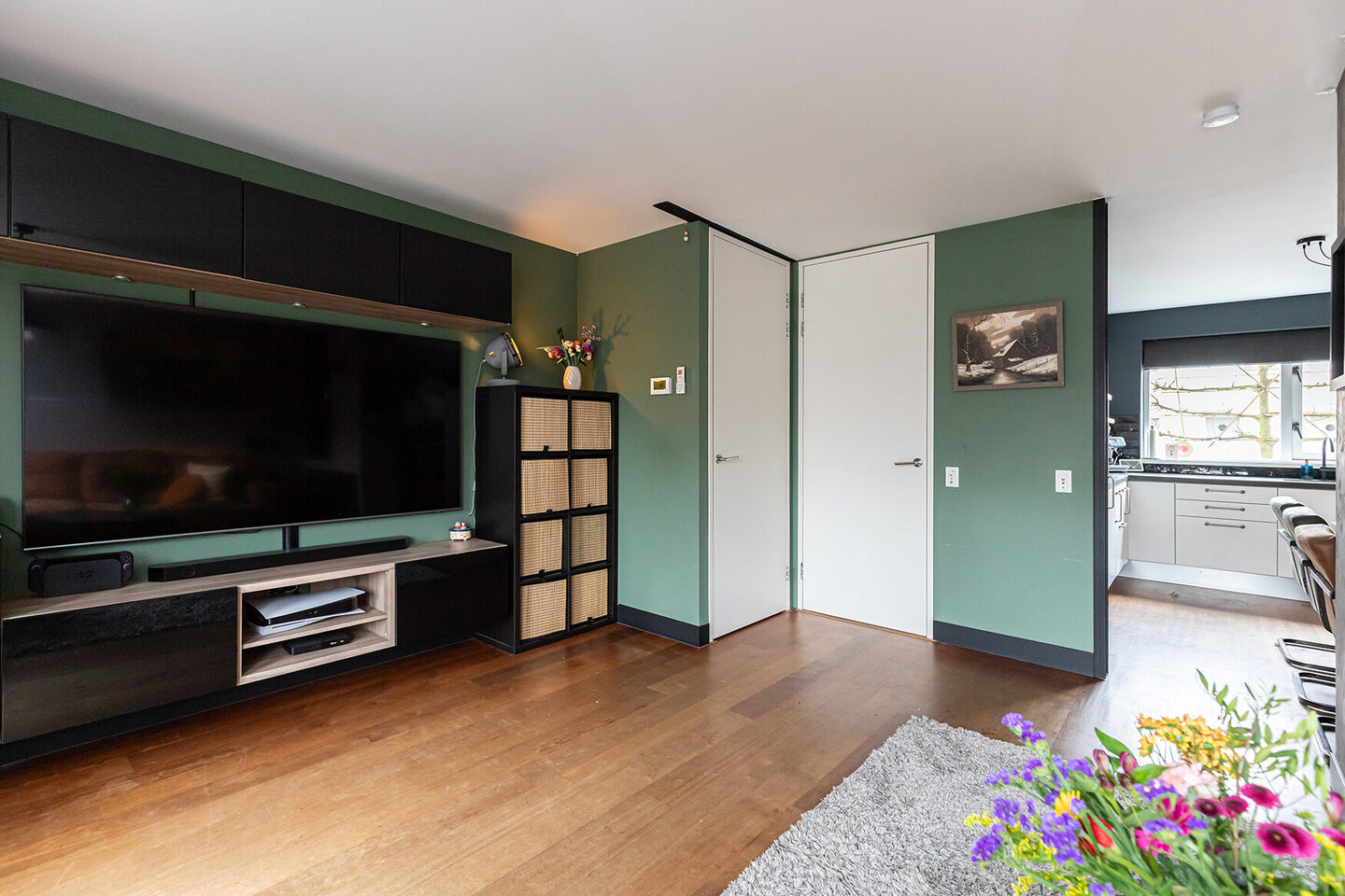 De begane grond beschikt over een royale woonkamer met voldoende ruimte voor zowel een zit- als leefgedeelte. De open keuken is uitgevoerd met inbouwapparatuur en biedt praktische werk- en bergruimte. Bovendien is er in de keuken voldoende ruimte voor een royale eethoek. Over de gehele begane grond ligt een afzelia vloer, wat zorgt voor een duurzame en consistente afwerking.