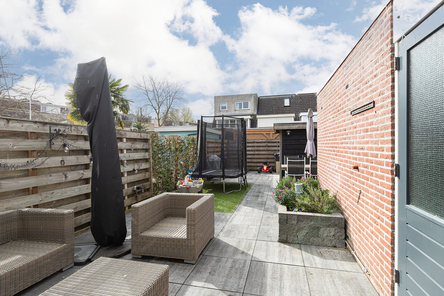 De achtertuin is op het zuiden gelegen en biedt daardoor veel zonuren gedurende de dag. De tuin is praktisch ingericht en beschikt over twee bergingen. De aangebouwde stenen berging is voorzien van water- en elektra-aansluitingen, wat extra gebruiksmogelijkheden biedt. Daarnaast is er een vrijstaande houten berging met elektra aanwezig.