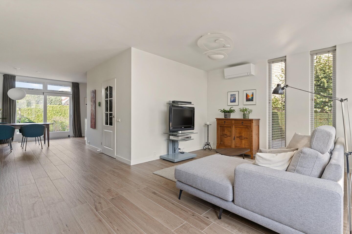 Bij binnenkomst valt direct de verzorgde afwerking op. De hal geeft toegang tot het moderne toilet, de trapopgang, de meterkast en de woonkamer. Dankzij de grote ramen en de schuifpui naar de tuin is de woonkamer bijzonder licht. De stijlvolle afwerking geeft het geheel een rustige, eigentijdse uitstraling. De keuken, uitgevoerd in wit met een antraciet keramisch werkblad, is uitgerust met Siemens inbouwapparatuur zoals een inductiekookplaat, oven, magnetron, koelkast, vaatwasser en afzuigkap. De sfeervolle Siematic wandplank met ledverlichting maakt het geheel compleet. Via de bijkeuken, waar ook de wasmachineaansluiting is, loop je zo de tuin of de garage in.