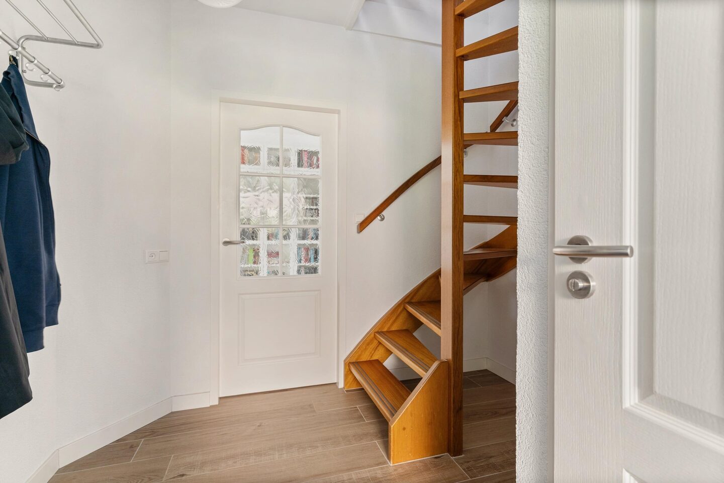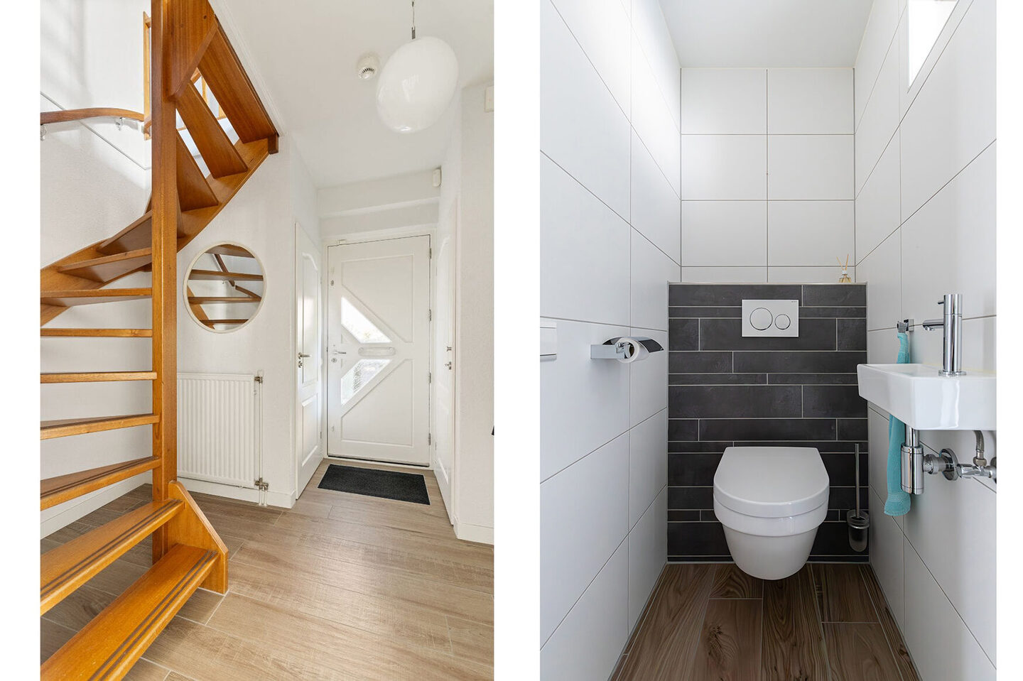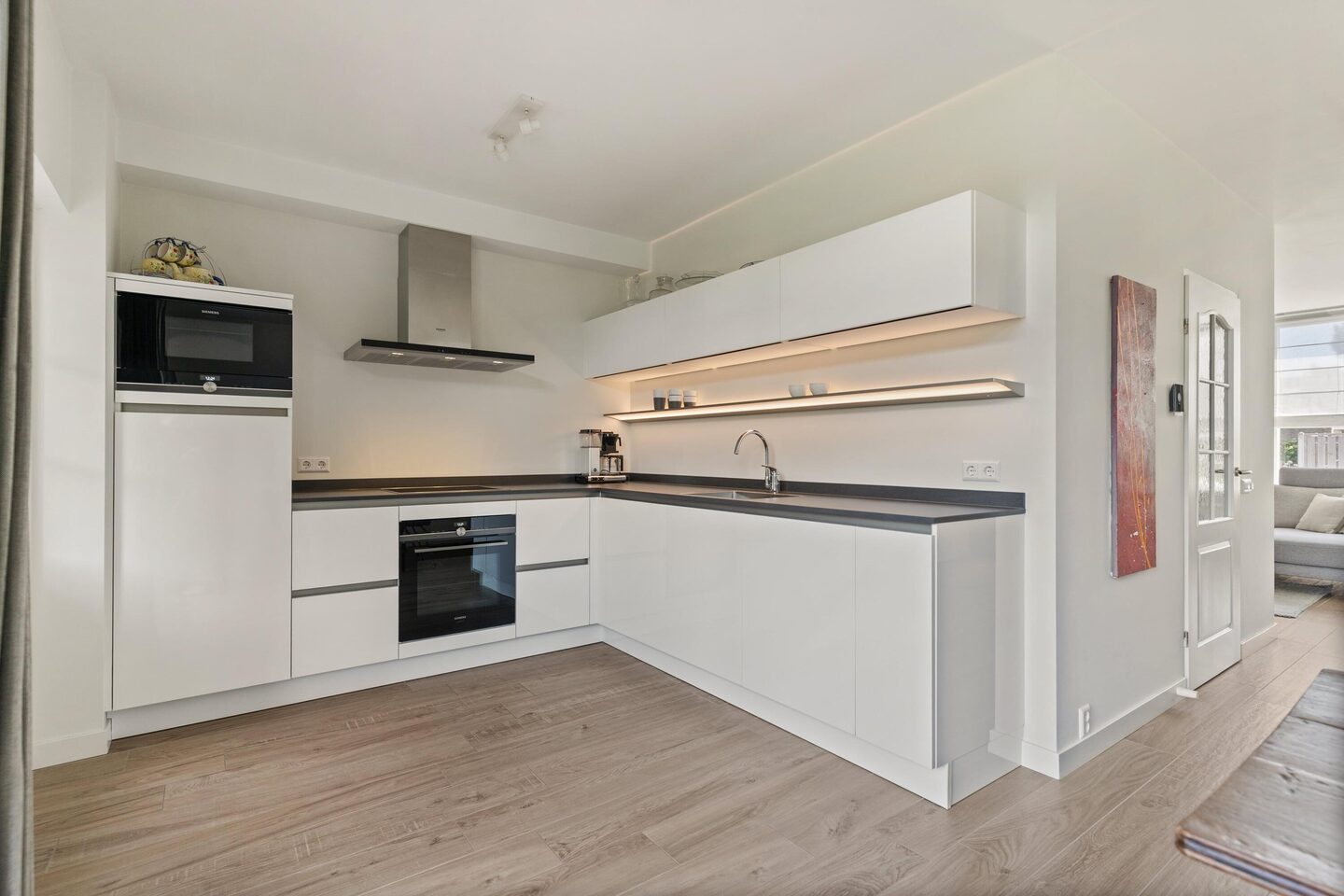 Bij binnenkomst valt direct de verzorgde afwerking op. De hal geeft toegang tot het moderne toilet, de trapopgang, de meterkast en de woonkamer. Dankzij de grote ramen en de schuifpui naar de tuin is de woonkamer bijzonder licht. Het interieur heeft een rustige, eigentijdse uitstraling. De keuken, uitgevoerd in wit met een antraciet keramisch werkblad, is uitgerust met een inductiekookplaat, oven, magnetron, koelkast, vaatwasser en afzuigkap. De sfeervolle wandplank met ledverlichting maakt het geheel compleet. Via de bijkeuken, waar ook de wasmachineaansluiting is, loop je zo de tuin of de garage in.