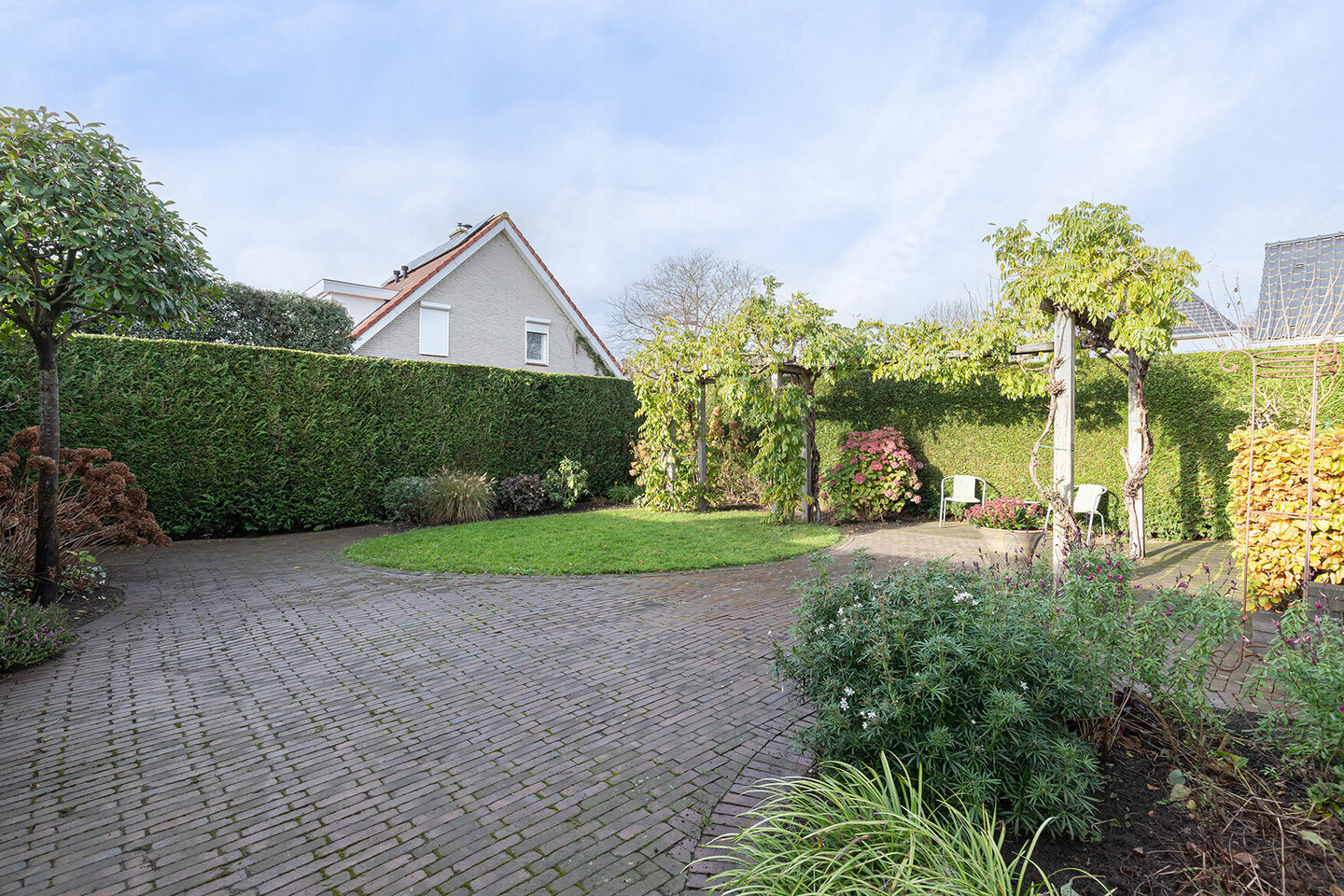 De tuin met sierbestrating, gevarieerde beplanting, gazon en meerdere zitplekken, biedt volop mogelijkheden om te genieten van het buitenleven. De tuin ligt op het westen en biedt veel privacy dankzij de groene omheining.