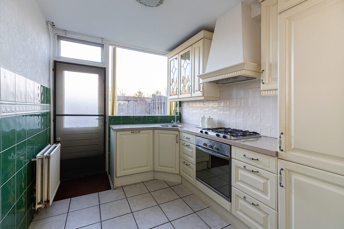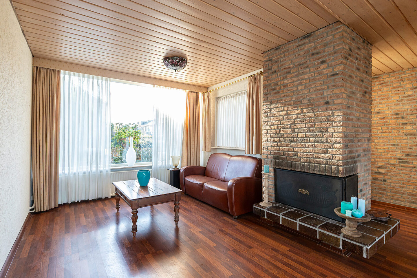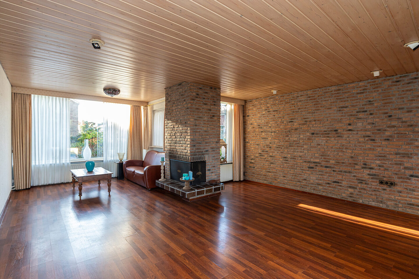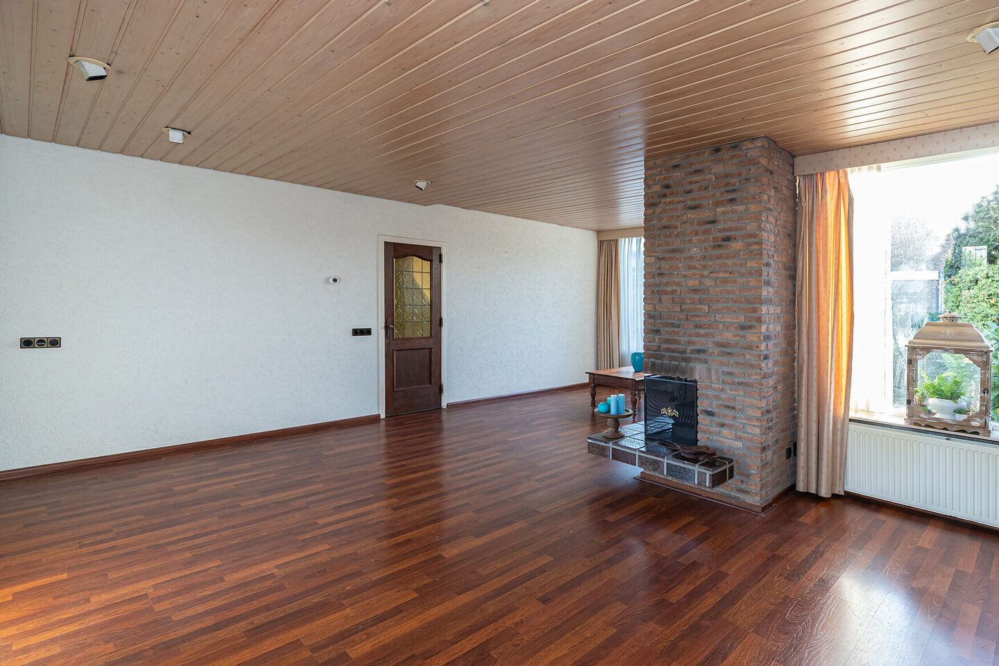 Via de entree kom je in de hal met toilet, trapopgang en toegang tot de woonkamer. De royale woonkamer vormt het hart van de woning en biedt dankzij de uitbouw aan de zijkant volop leefruimte. De open haard zorgt voor sfeer en warmte, terwijl de indeling uitnodigt tot een comfortabele zithoek en een ruime eethoek. De dichte keuken is praktisch ingericht, voorzien van inbouwapparatuur, waarbij de kookplaat en de combi-oven moeten worden vervangen, en biedt direct toegang tot de tuin.