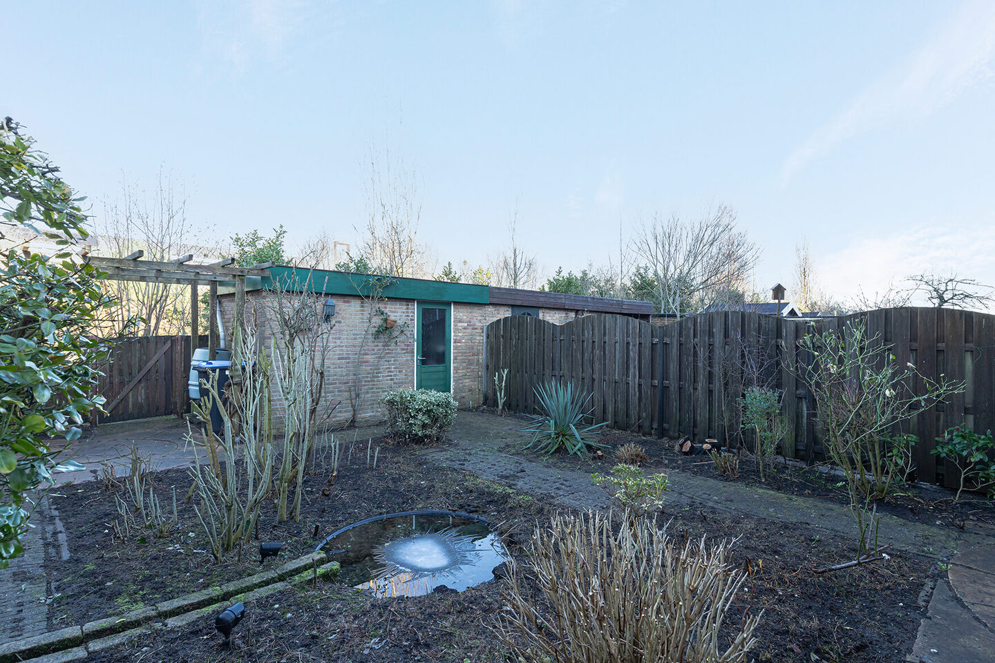 De achtertuin is gelegen op het noordoosten en verzorgd aangelegd met diverse bestrating en beplanting. Een fijne buitenruimte waar je in alle rust kunt genieten. De vrijstaande stenen berging biedt extra opslagruimte voor fietsen en tuinspullen.