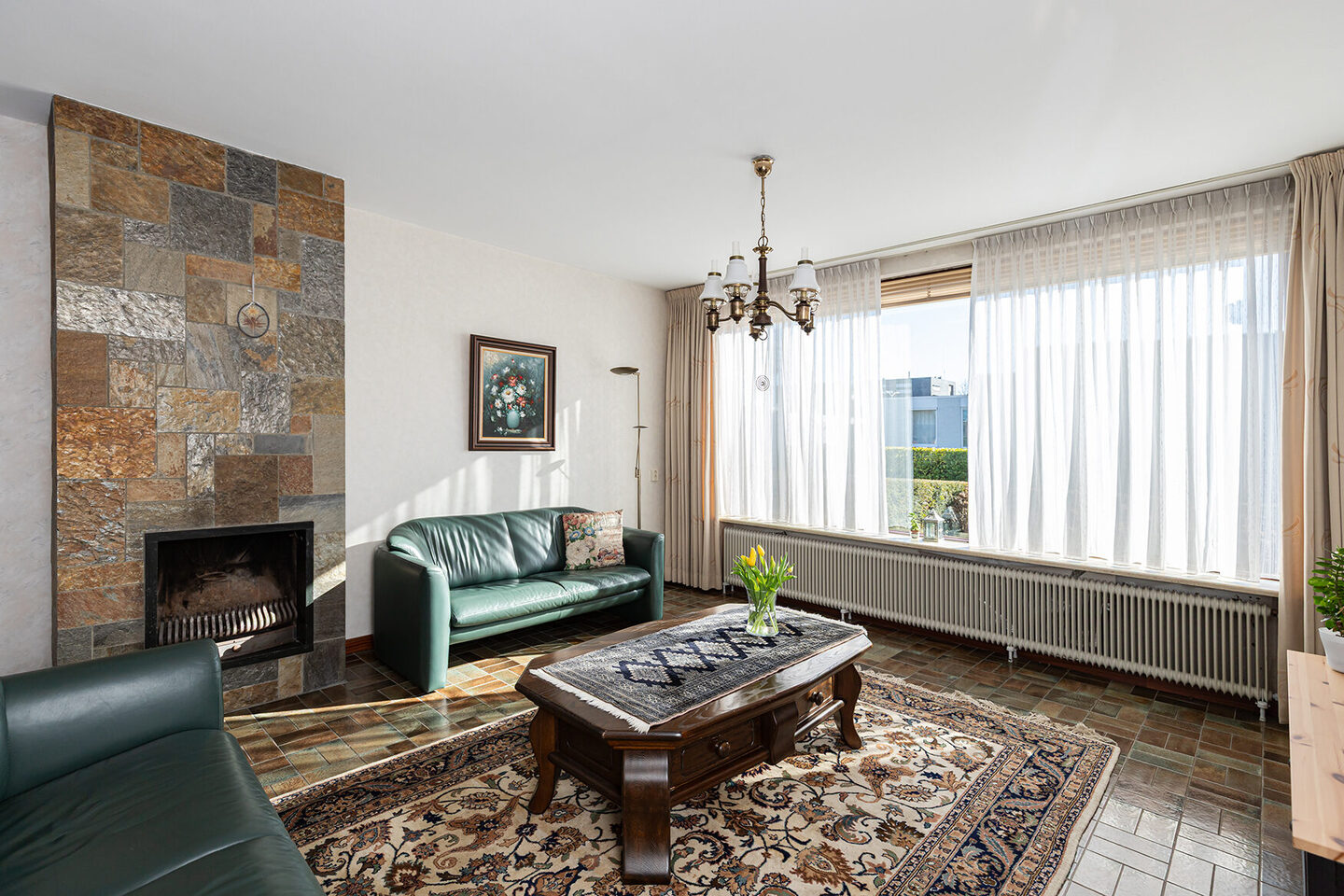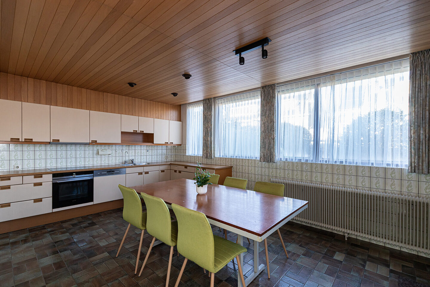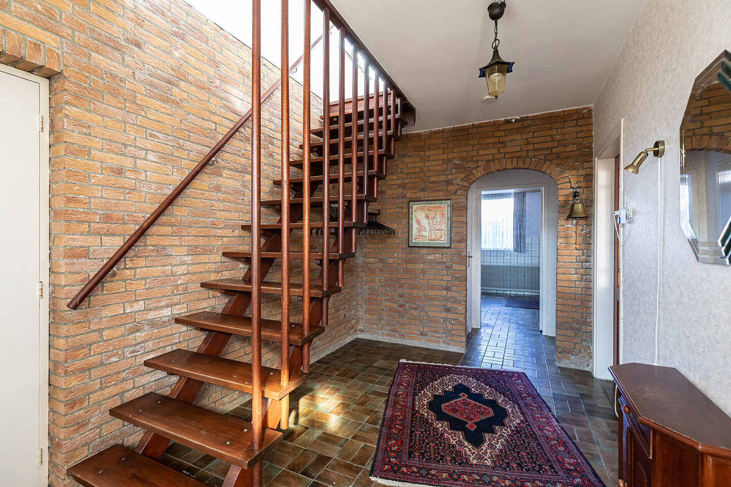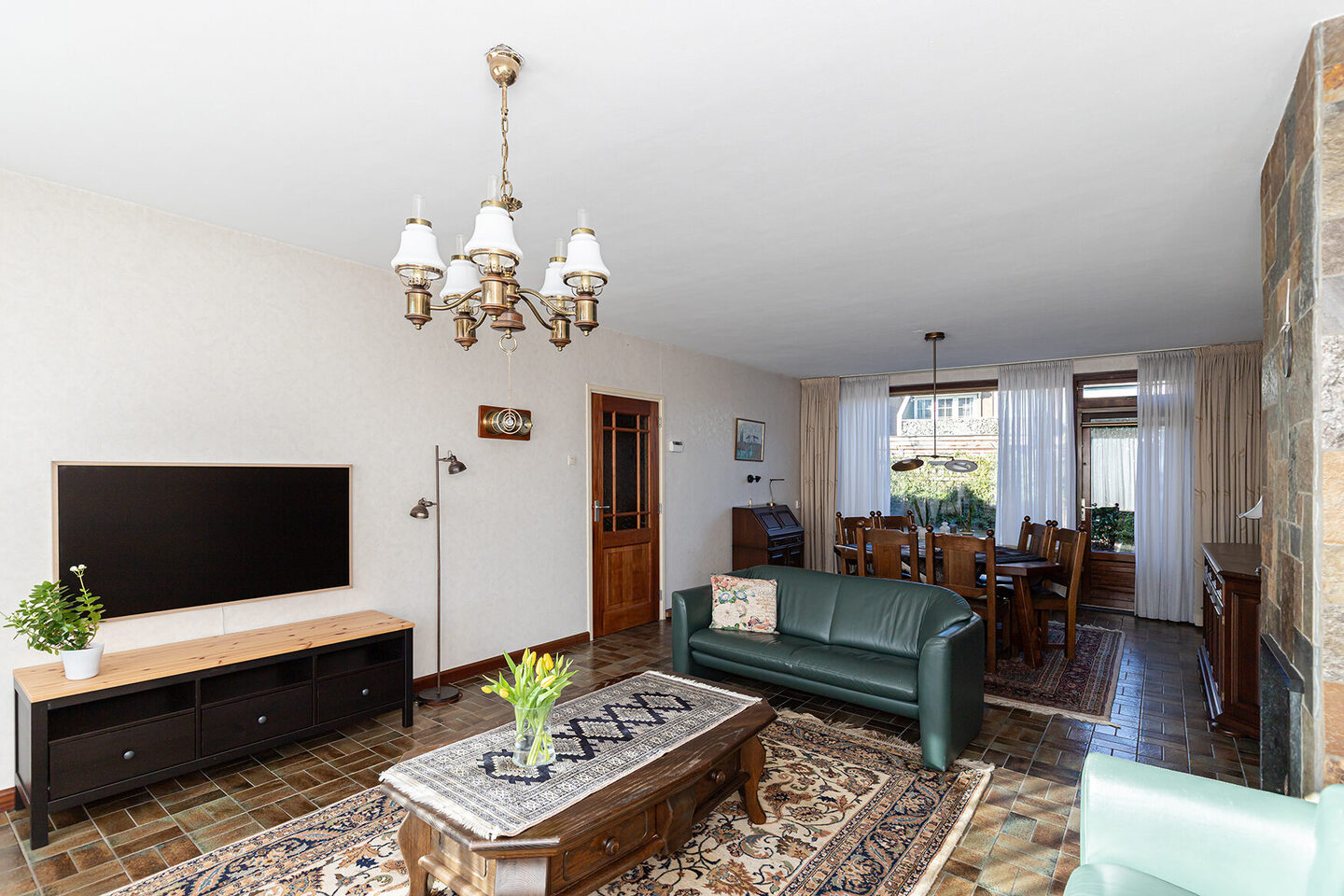 De woonkamer biedt ruim plaats aan een comfortabele zithoek en een royale eethoek. De open haard vormt een centraal element in de ruimte en geeft de woonkamer extra karakter. De woonkeuken biedt volop plek om te koken en samen te komen. Via de keuken heeft u directe toegang tot de achtertuin.