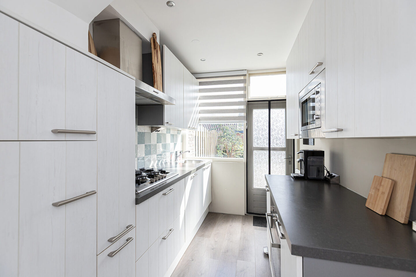 Via de hal met toiletruimte, trapopgang en meterkast kom je in de woonkamer, waar het daglicht mooi door de ruimte stroomt. Aansluitend bevindt zich de keuken, uitgevoerd met aan weerszijden een keukenopstelling in wit met een grijs stenen werkblad. De inbouwapparatuur is van Etna, waaronder een 5-pits gasstel, oven, magnetron, koelkast, vriezer, afzuigkap en vaatwasser. Vanuit de keuken is er direct toegang tot de tuin, wat het contact met buiten extra prettig maakt.