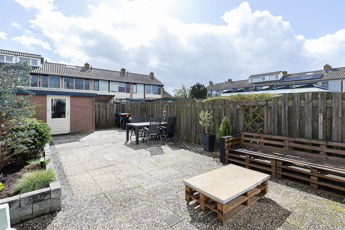 De achtertuin is opvallend diep en gunstig gesitueerd op het zuiden tot zuidoosten. Daardoor is dit een heerlijke plek om van de zon te genieten. Met een vrijstaande stenen berging, een groot terras, een groene border en een eigen achterom is dit een buitenruimte die zowel functioneel als sfeervol is.