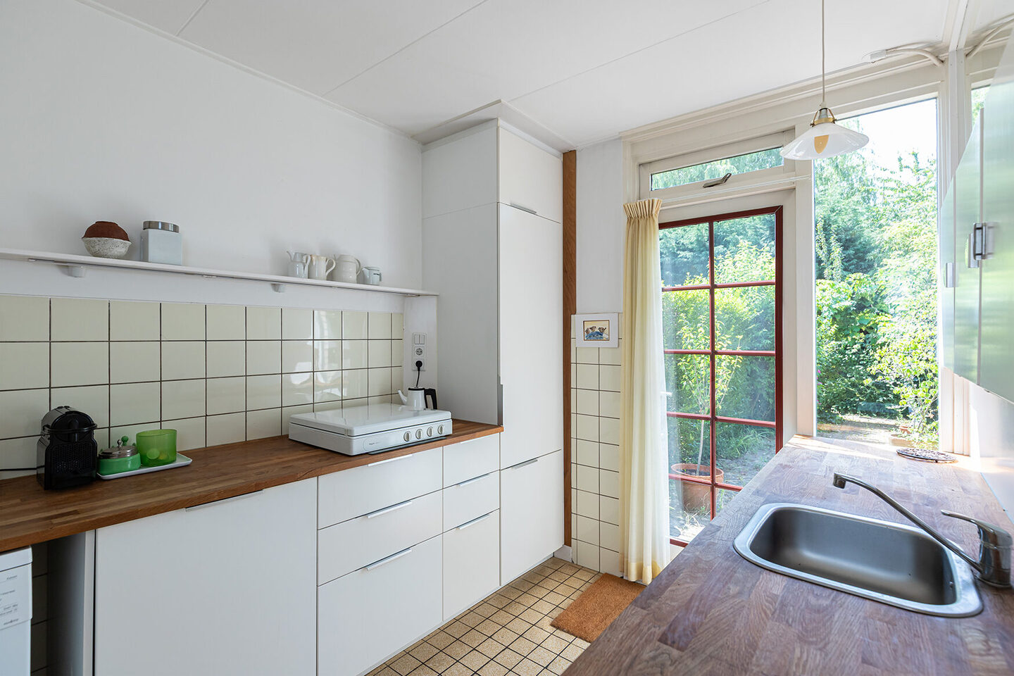 De dichte keuken is voorzien van een nette, witte keukeninrichting met veel opbergruimte. Vanuit de keuken is er directe toegang tot de tuin.