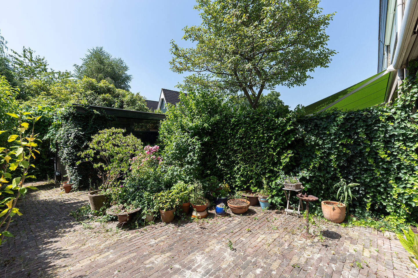 De achtertuin is zonnig gelegen op het zuiden en biedt veel privacy. De tuin is voorzien van een terras, sierbestrating en volwassen beplanting. Er is een stenen berging met elektra en een praktische achterom aanwezig.